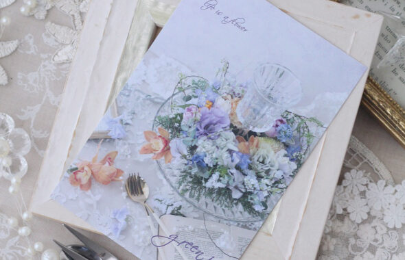 ポストカード<フレッシュパープルオレンジリース、グラス付き>