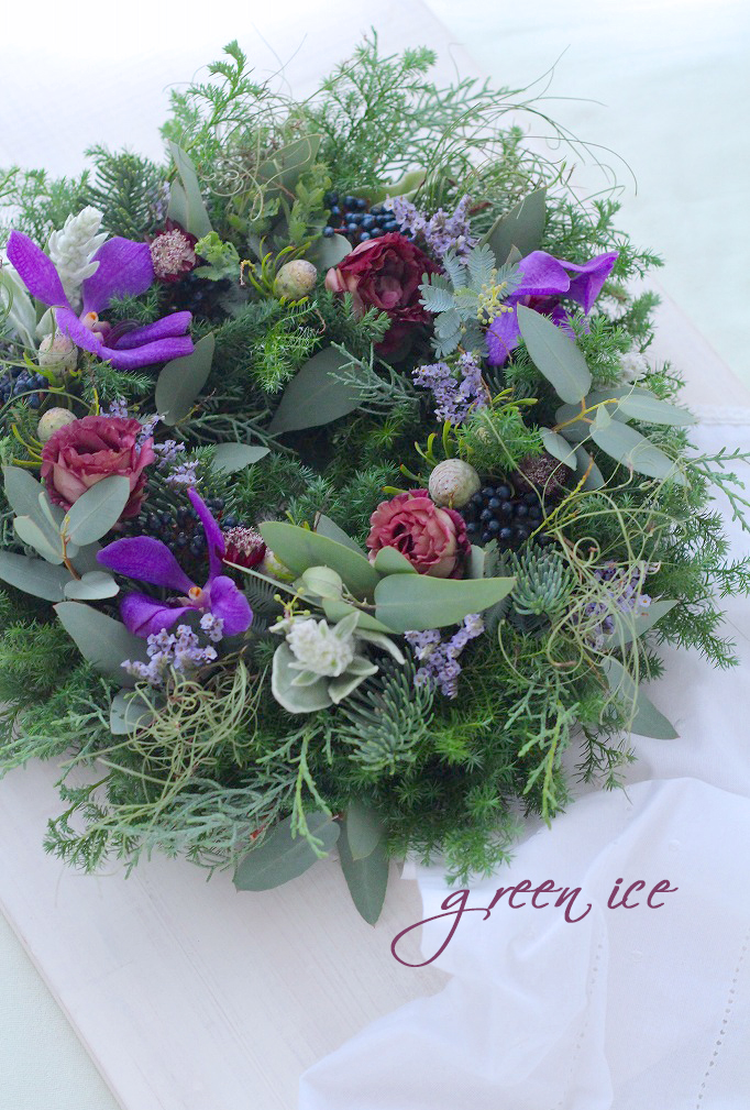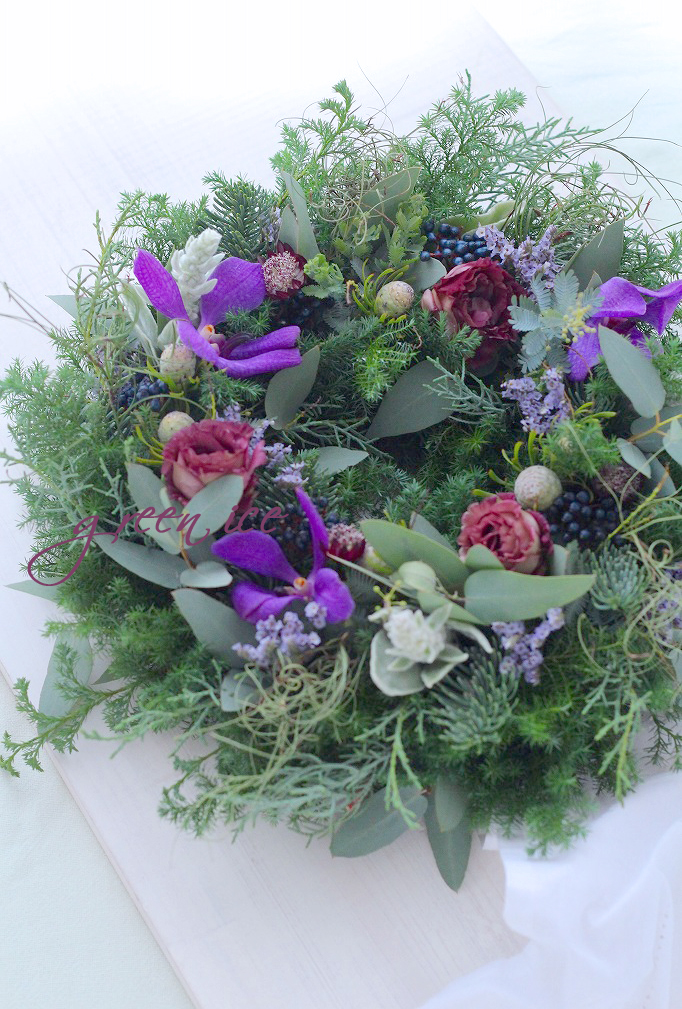 クリスマスリースじゃなくて、ドライにならなくてもいいという設定でのフレッシュグリーンリースとなってます。
