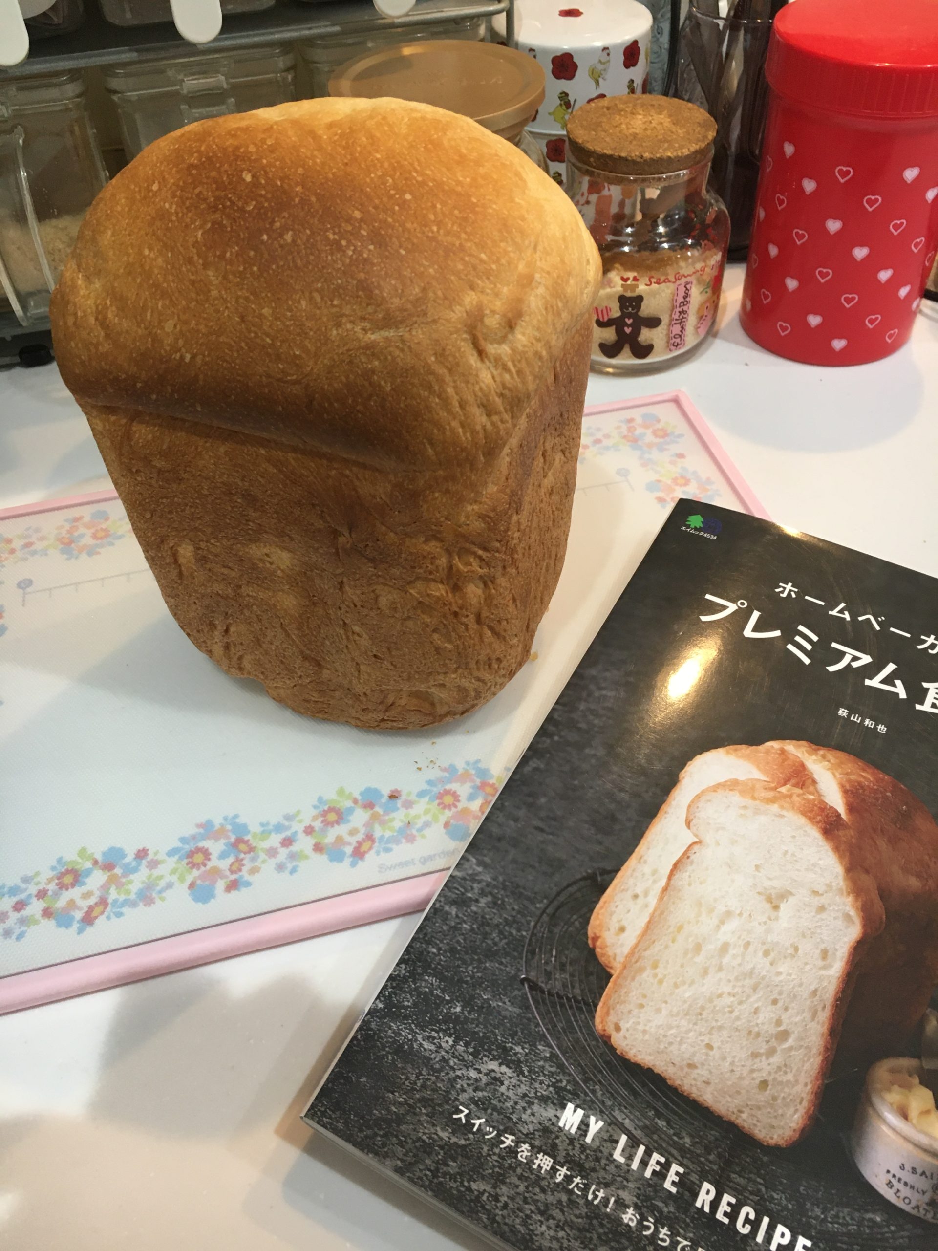 少し前に、本屋さんで、ホームベーカリーでプレミアム食パン、という本を見つけて、その中でも、1番目に出てきた、基本のプレミアム食パン、の配合で焼いてみました。