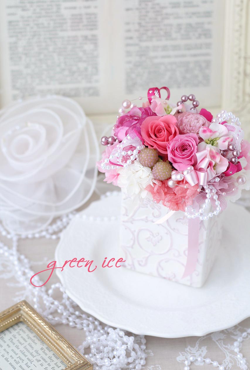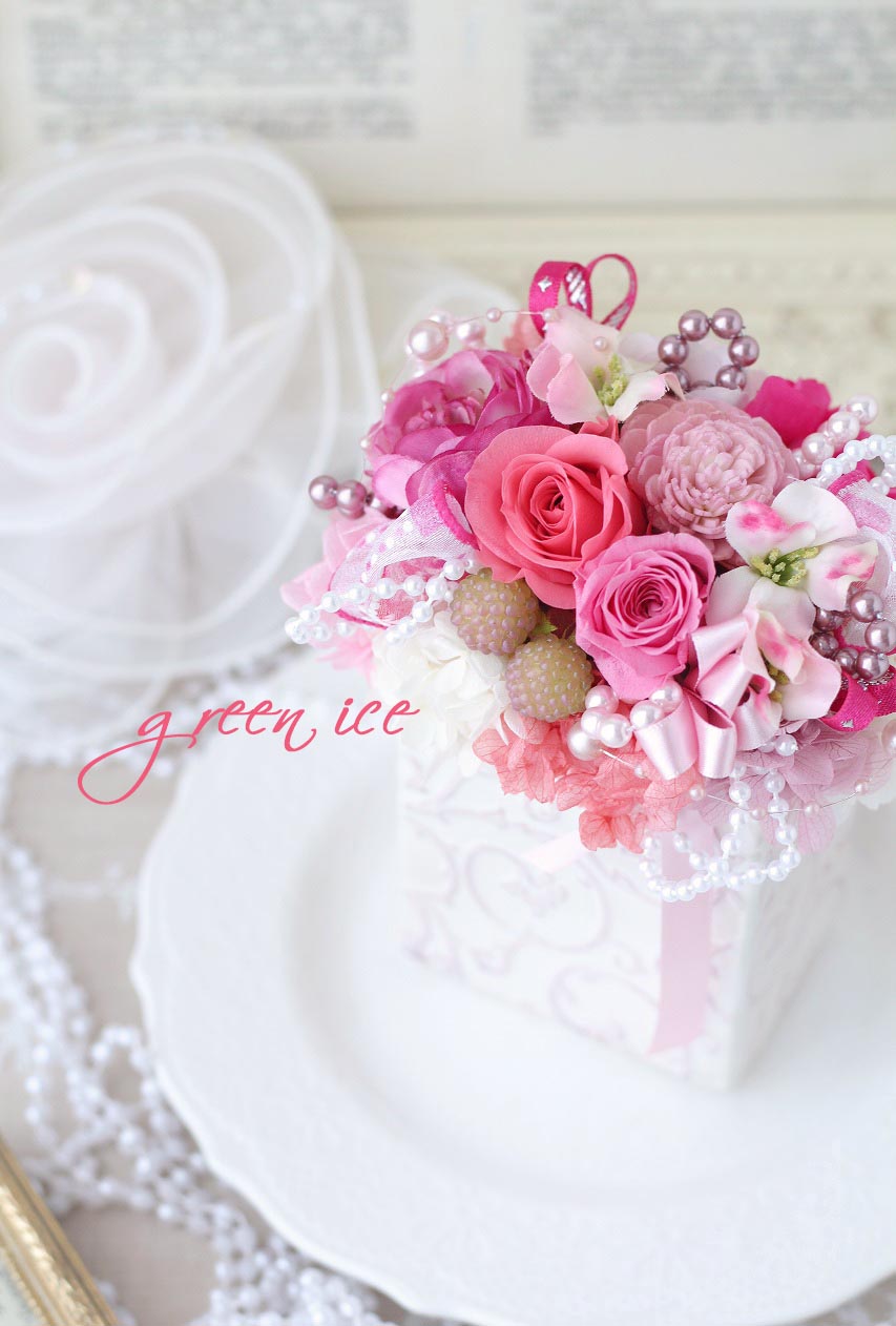 キャンディピンクカラーのプリザーブドローズをメインに、キュートにお作りさせていただきました~~
