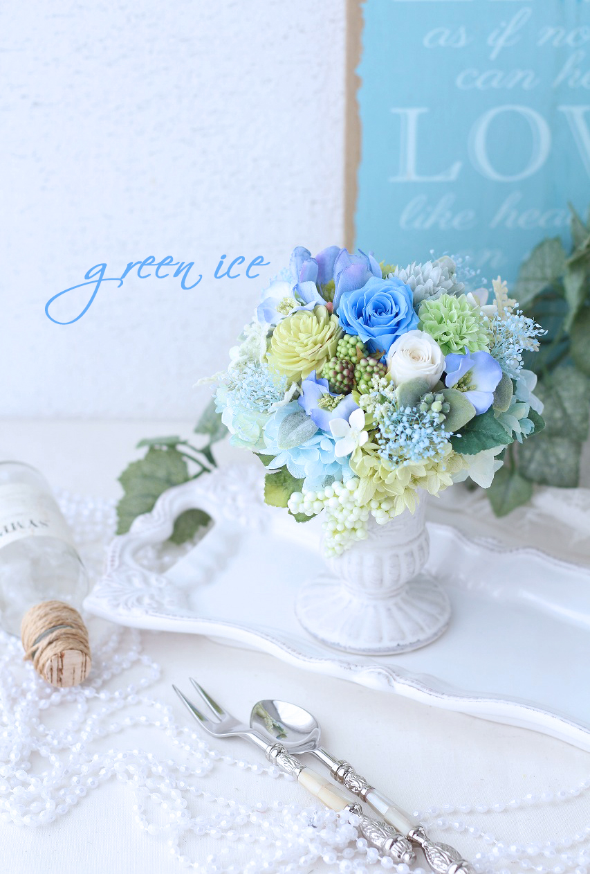 ソーダブルーカラーのプリザーブドローズをメインにしています。