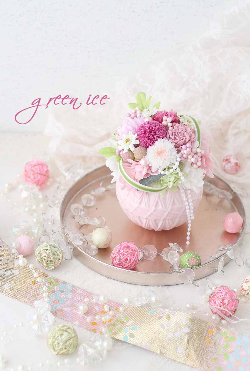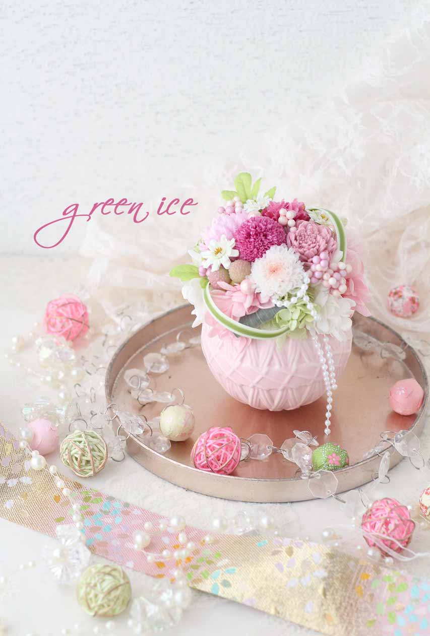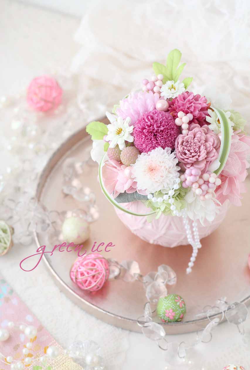 デモの際は、私は、ピンクの器を使い、プリザーブドマム(菊)も、ポンポンマムは、濃いピンクのものを、小菊は、ホワイトとピンクの複色のものをメインに、ピンク多めの花材で作らせていただきました。
