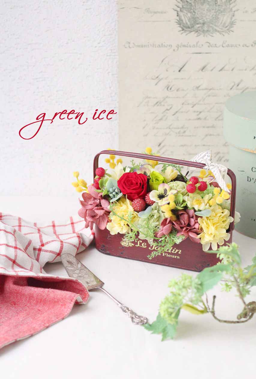 ギフト発送・ハンドル付き横長ブリキアレンジ、制作風景・花材資材セット販売も