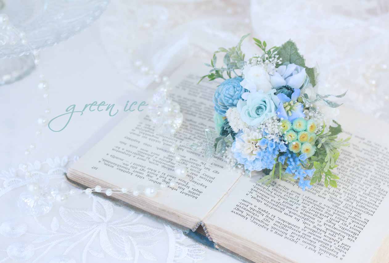 ドレスが、シンプルな、ブルーとブラックのふんわりしたドレスでしたのと、可愛い感じをご希望でしたので、水色をベースに、ホワイトを合わせて、挿し色にグリーン、ナチュラルな感じにデザインさせていただいています。