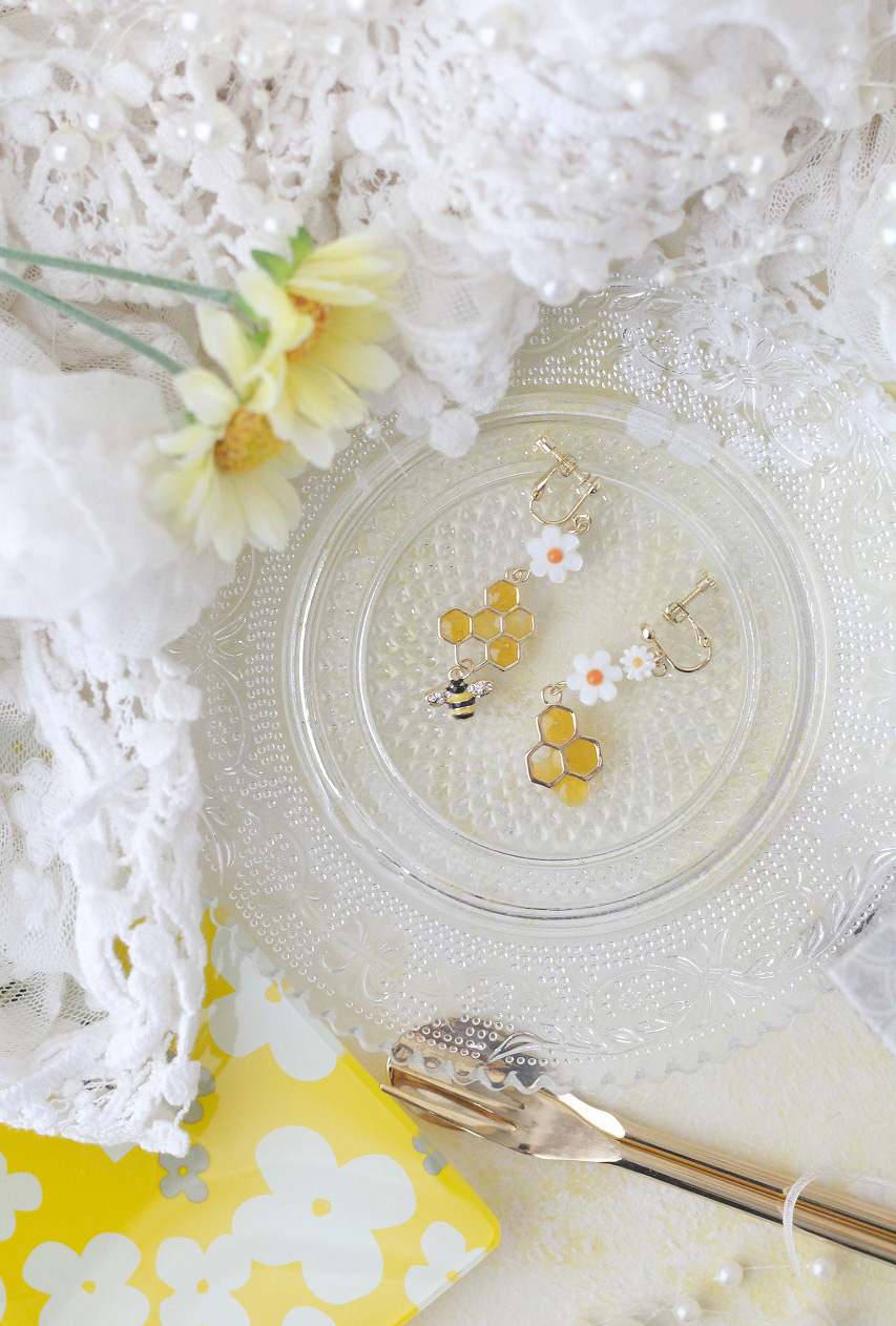 今日の写真は、パーツクラブさんのキットと、イヤリング金具をプラスして購入して作った、ハニカムイヤリングになります。
