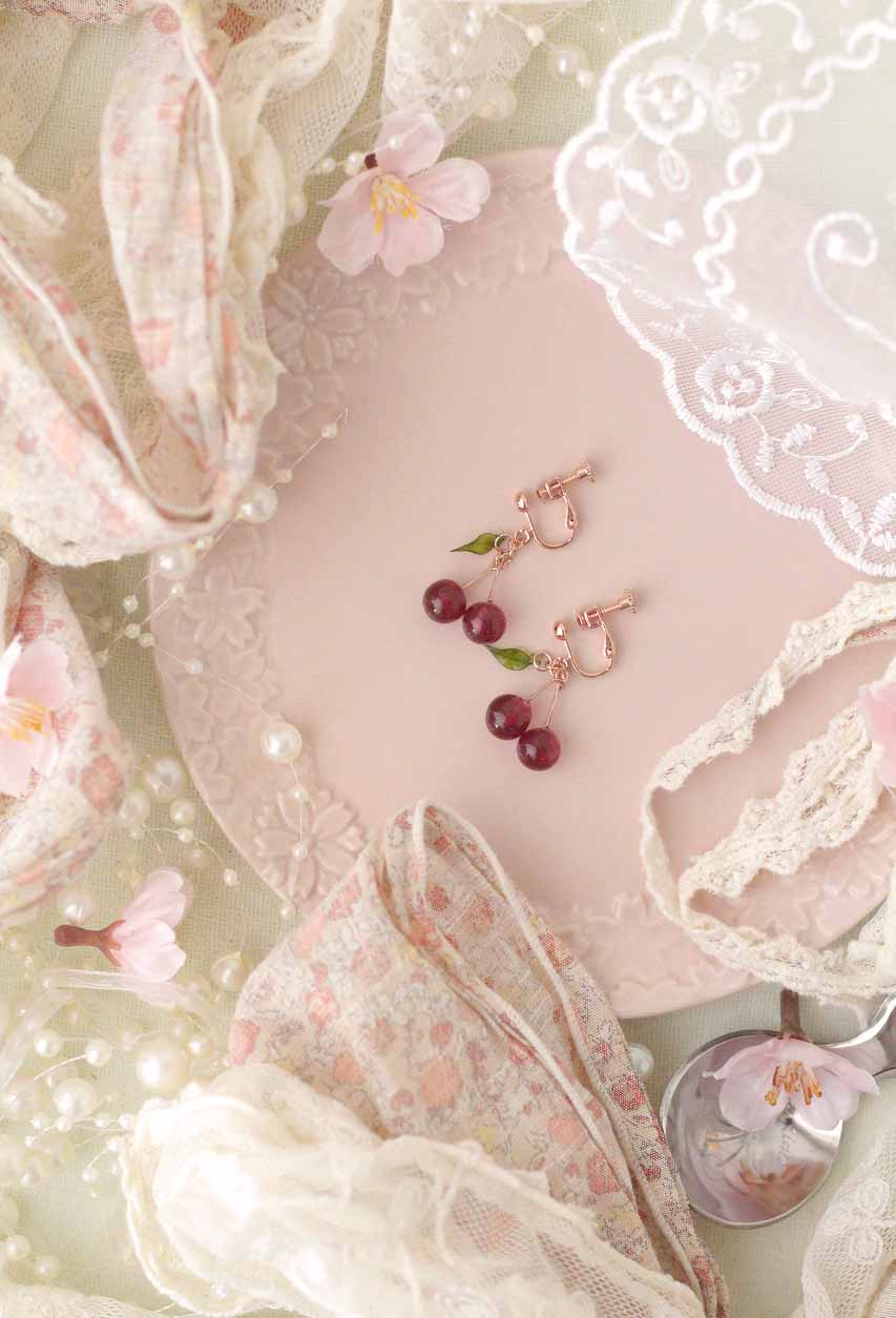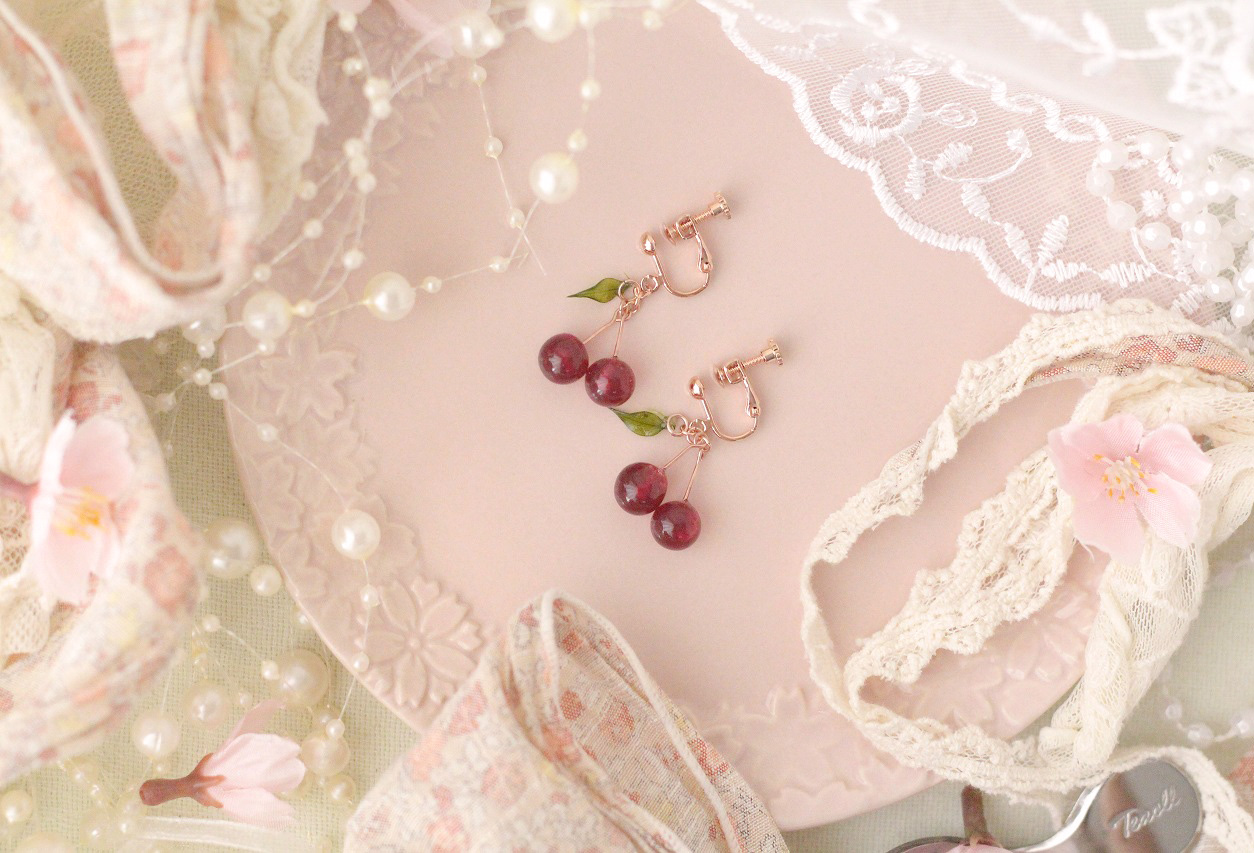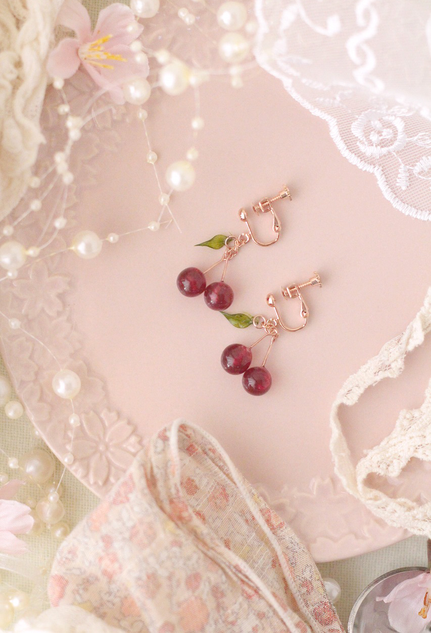 ミルームさんの動画レッスンを見ながら作った、プチチェリーピアスになります。