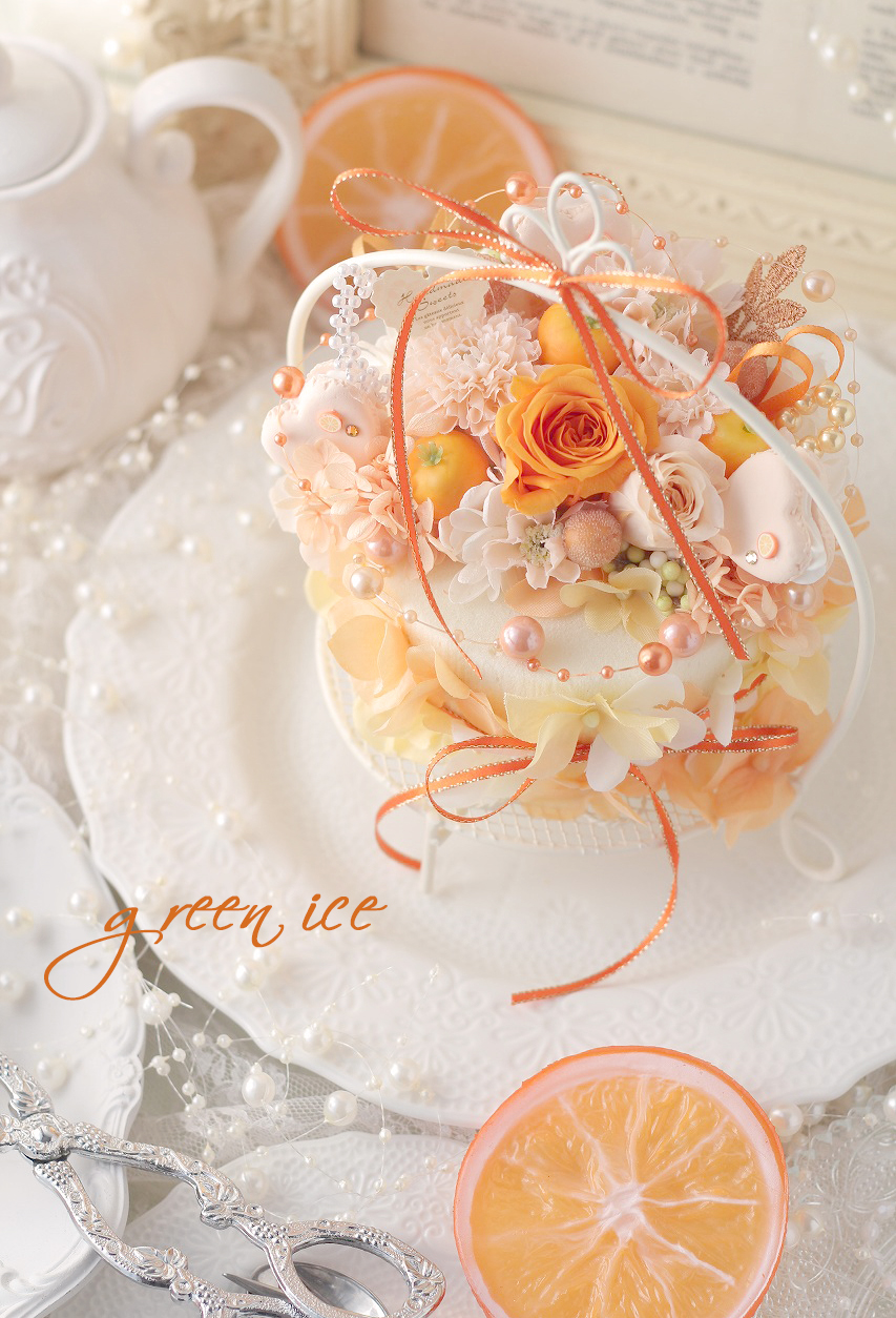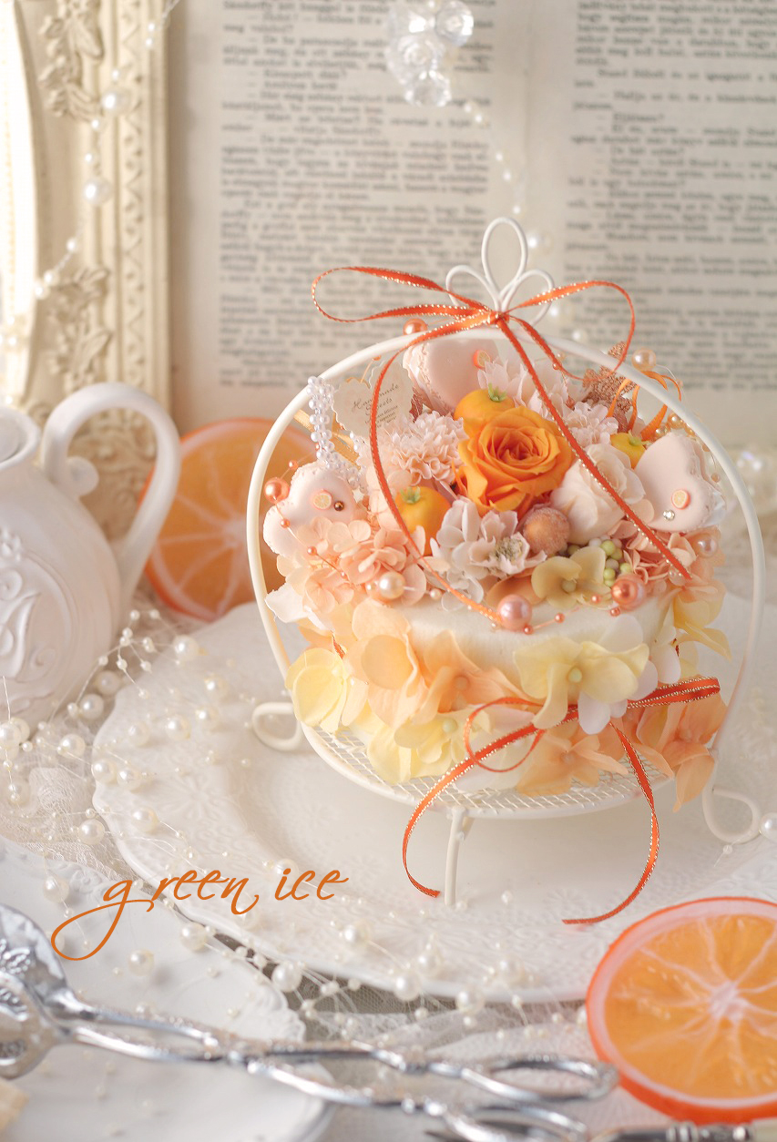ギフト発送、オレンジハートマカロンケーキアレンジ