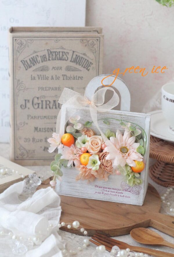ギフト発送、引き続き、ピーチオレンジウッドバッグアレンジ