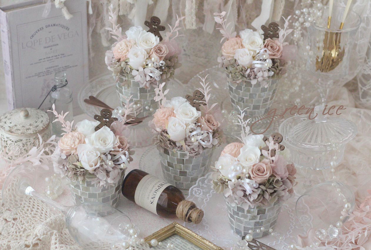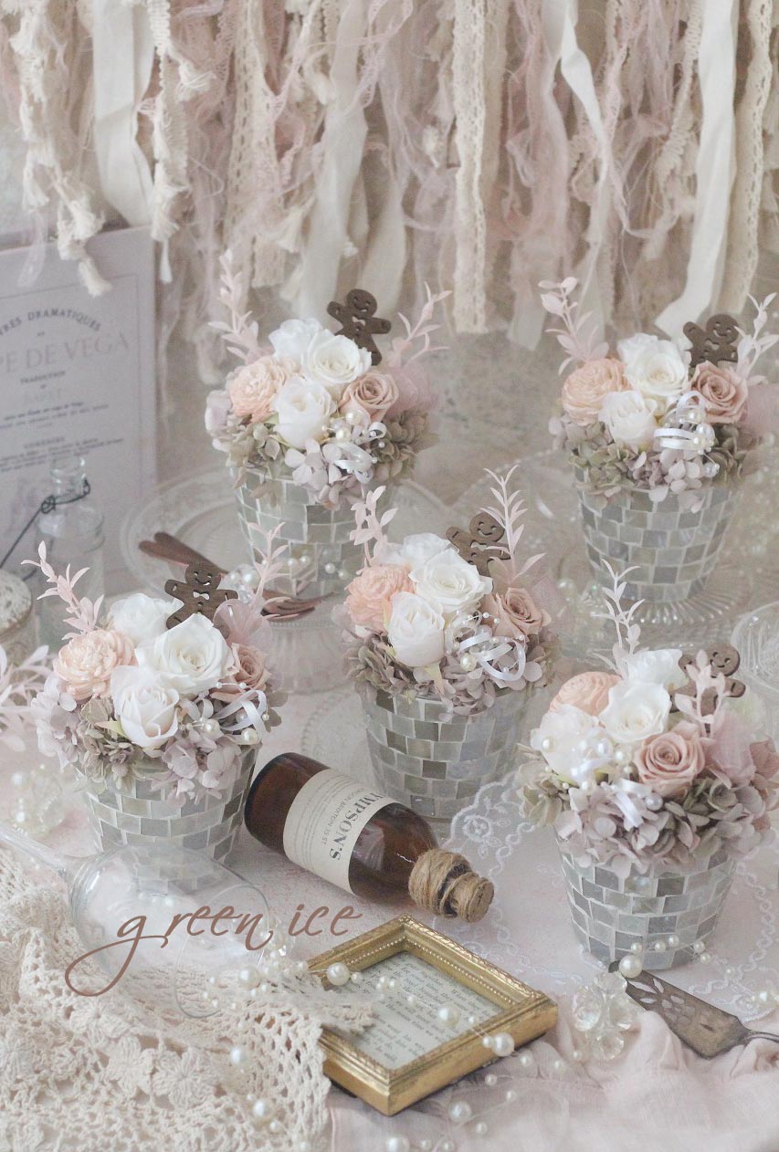 おすすめのガラスモザイクの器に、ホワイトアンティークピンクで、ジンジャーマンを添えた、ジンジャーマンフラワーアレンジ、お作りさせていただきました~