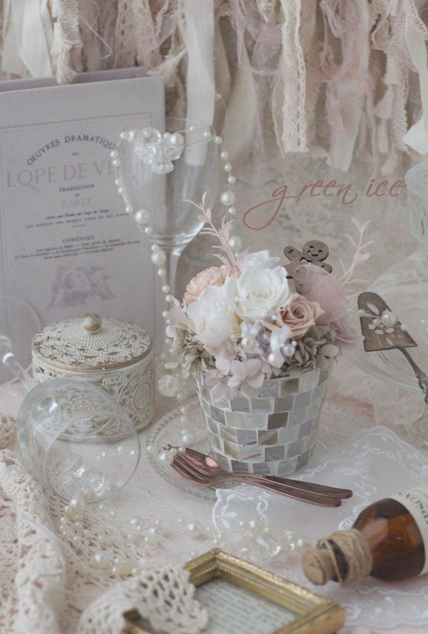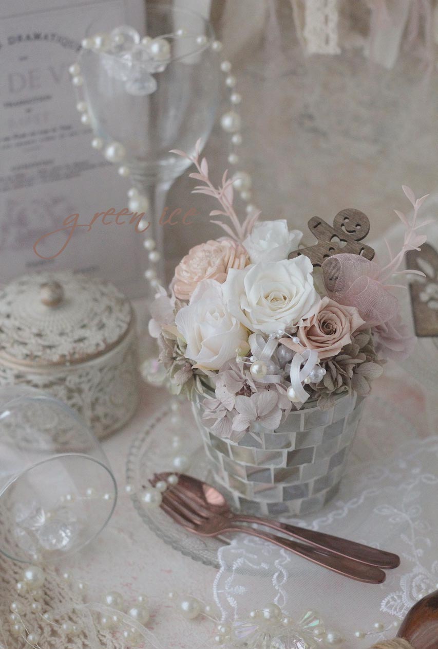 おすすめのガラスモザイクの器に、ホワイトアンティークピンクで、ジンジャーマンを添えた、ジンジャーマンフラワーアレンジ、お作りさせていただきました~