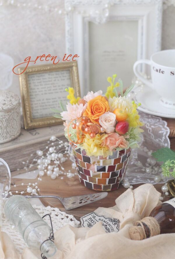 こちらも、これから発送させていただきます、ミモザカラフルガラスモザイクアレンジ、二つ目のご紹介になります。