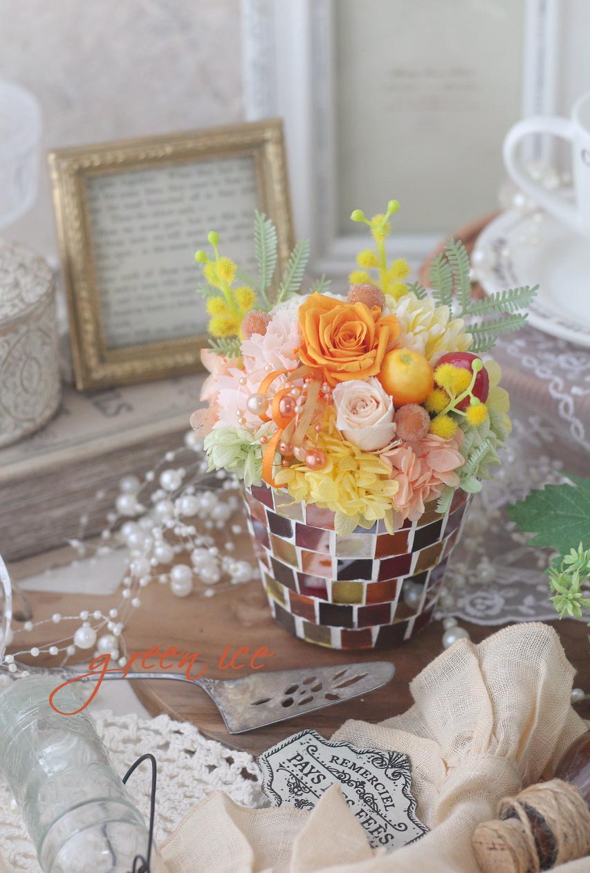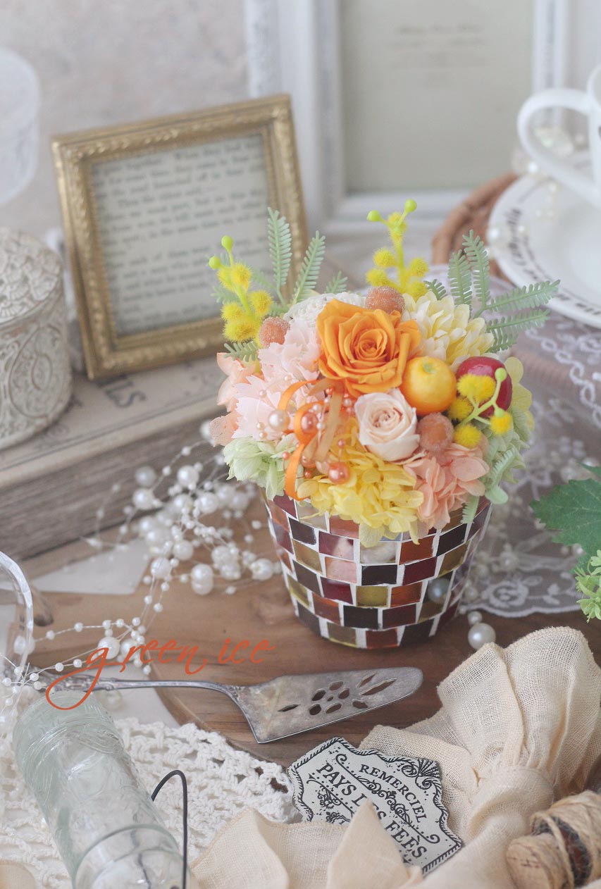 今日も、先日からご紹介しているミモザカラフルガラスモザイクアレンジ、これからギフト発送させていただく、3つめになります~