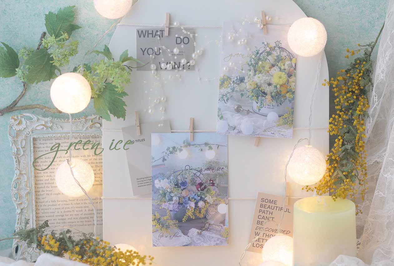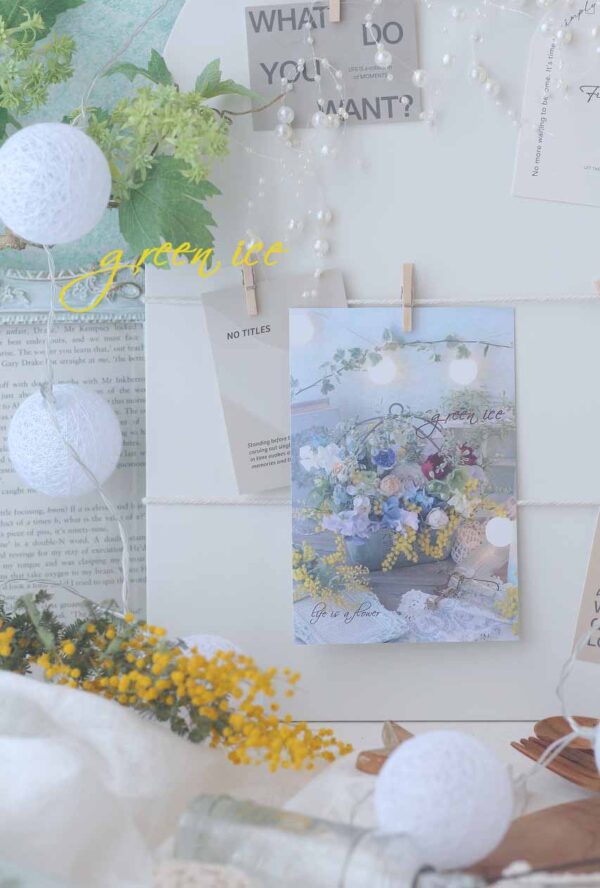 せっかくなので、昨日発売した、ミモザバードゲージアレンジのポストカードもはさんで、2枚合わせて、撮影してみました。
