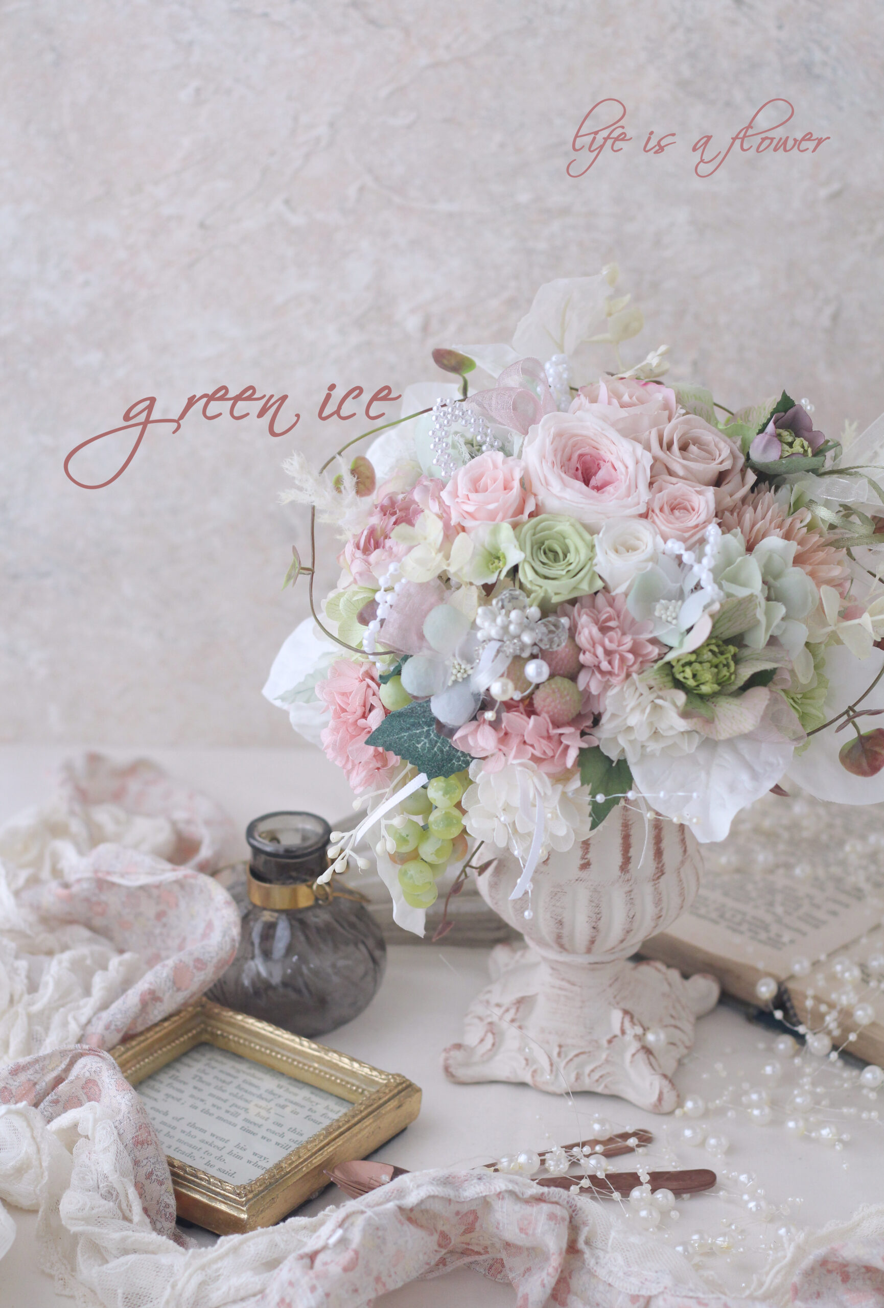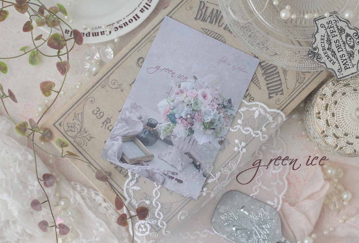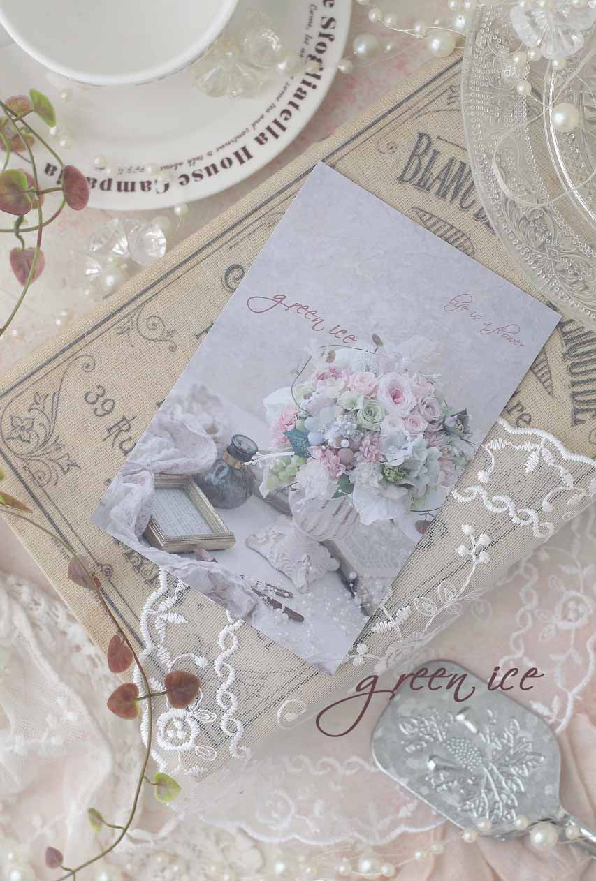 ポストカード販売中~プリザ・アート、ペールピンクグリーンアレンジ
