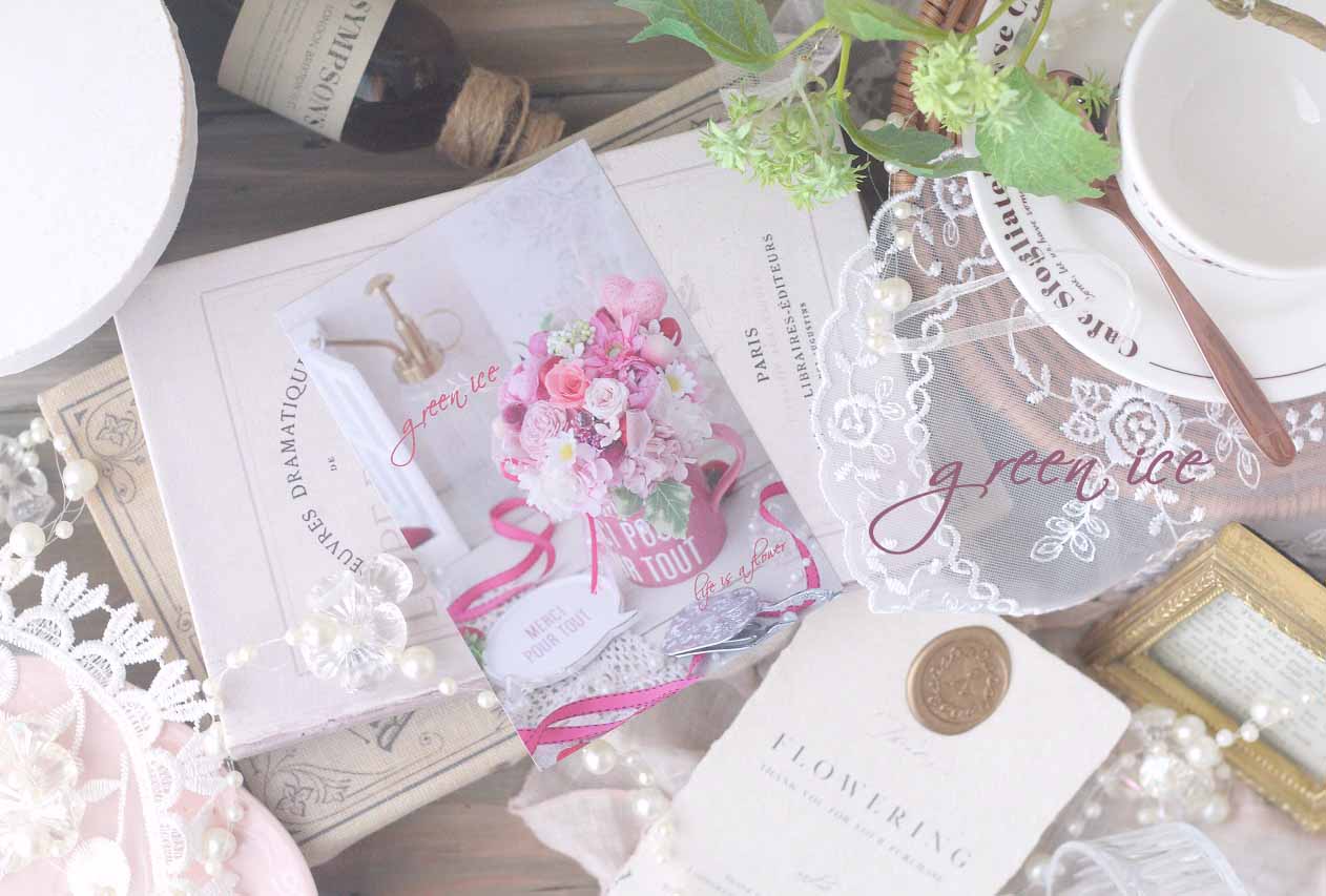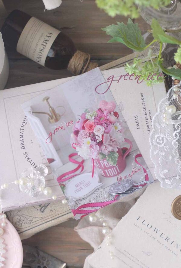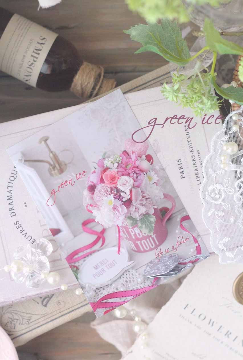 写真は、昨日から新発売のポストカードのうちの、プリザアート作品のポストカードになります。