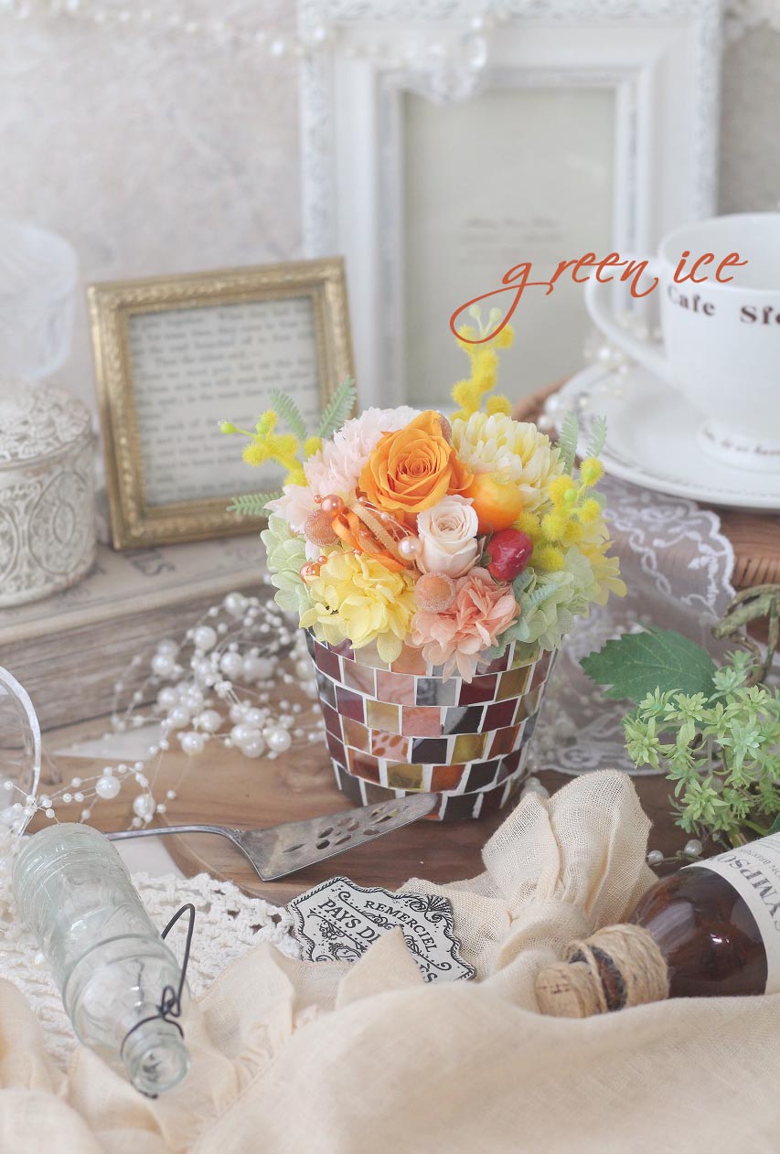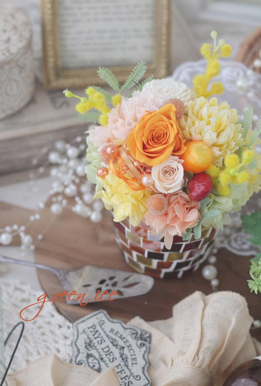 写真は、少し前に、ギフト発送させていただきました、ミモザカラフルガラスモザイクアレンジ、5つめになります~