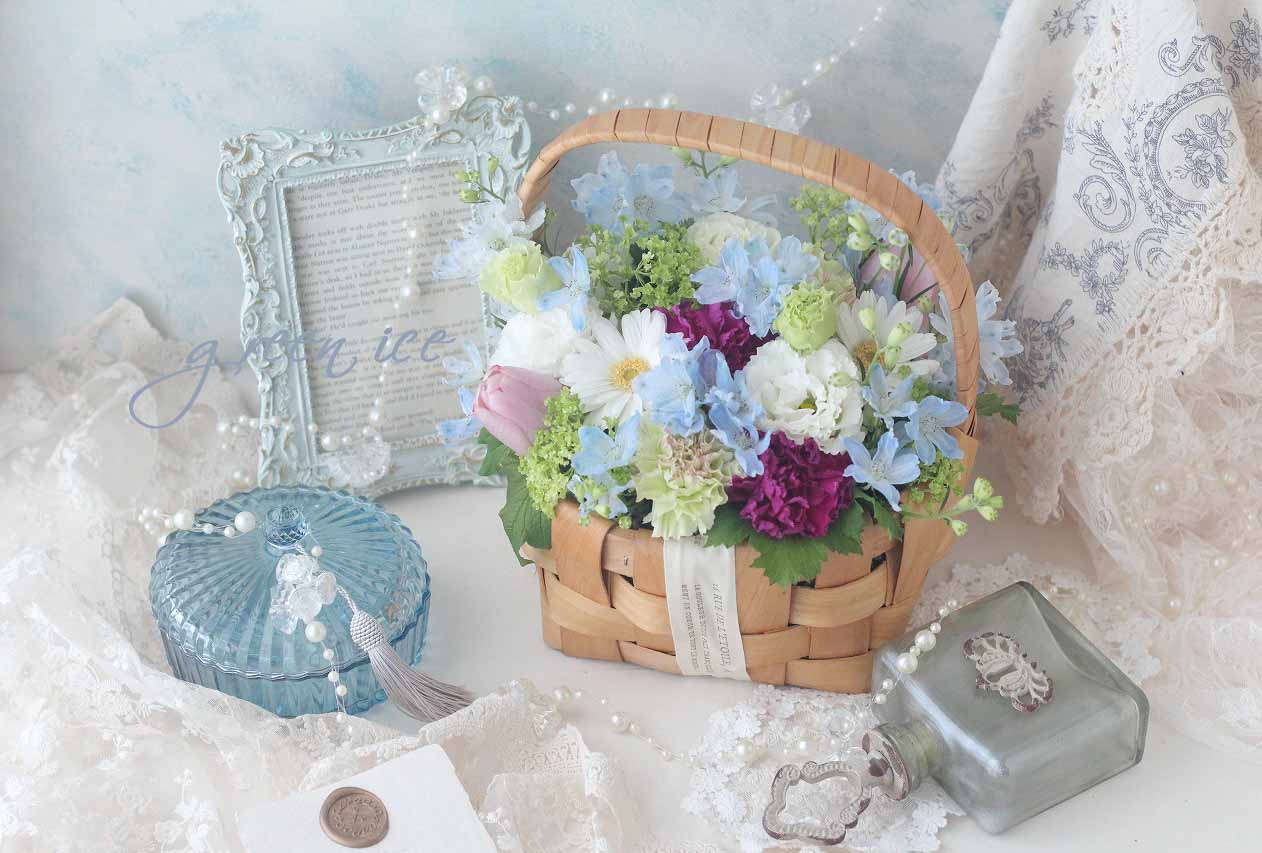4. フレッシュ、デルフィニウムバスケットアレンジ