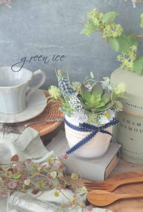 ギフト発送、アートグリーン多肉植物リボンカップアレンジ、2つ目