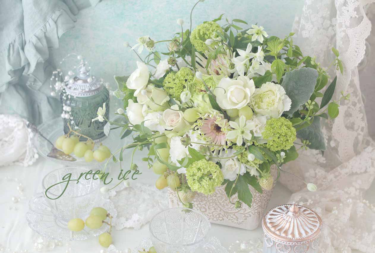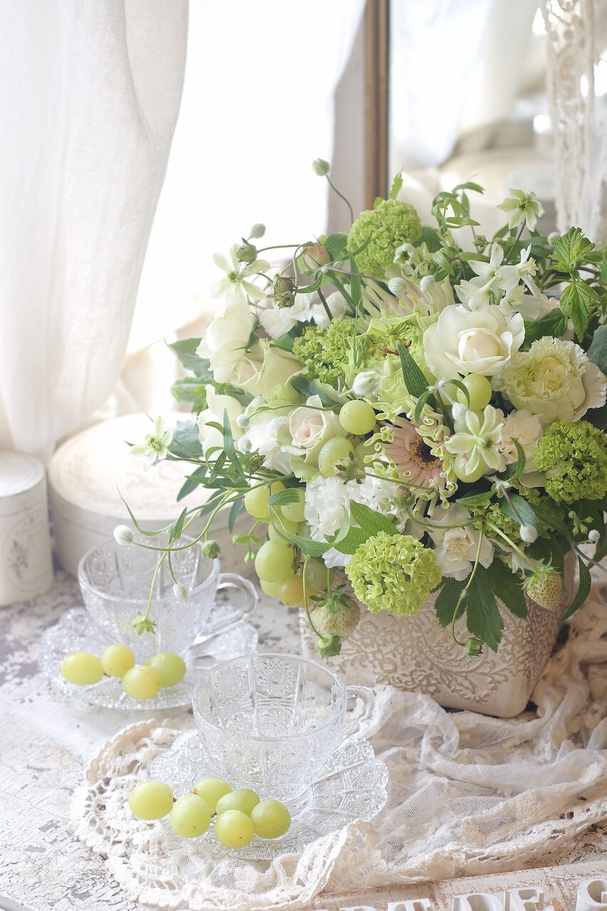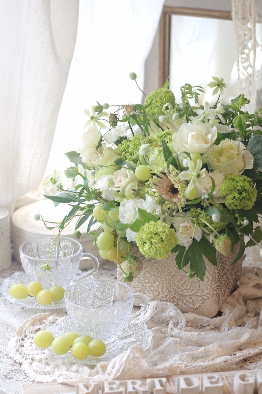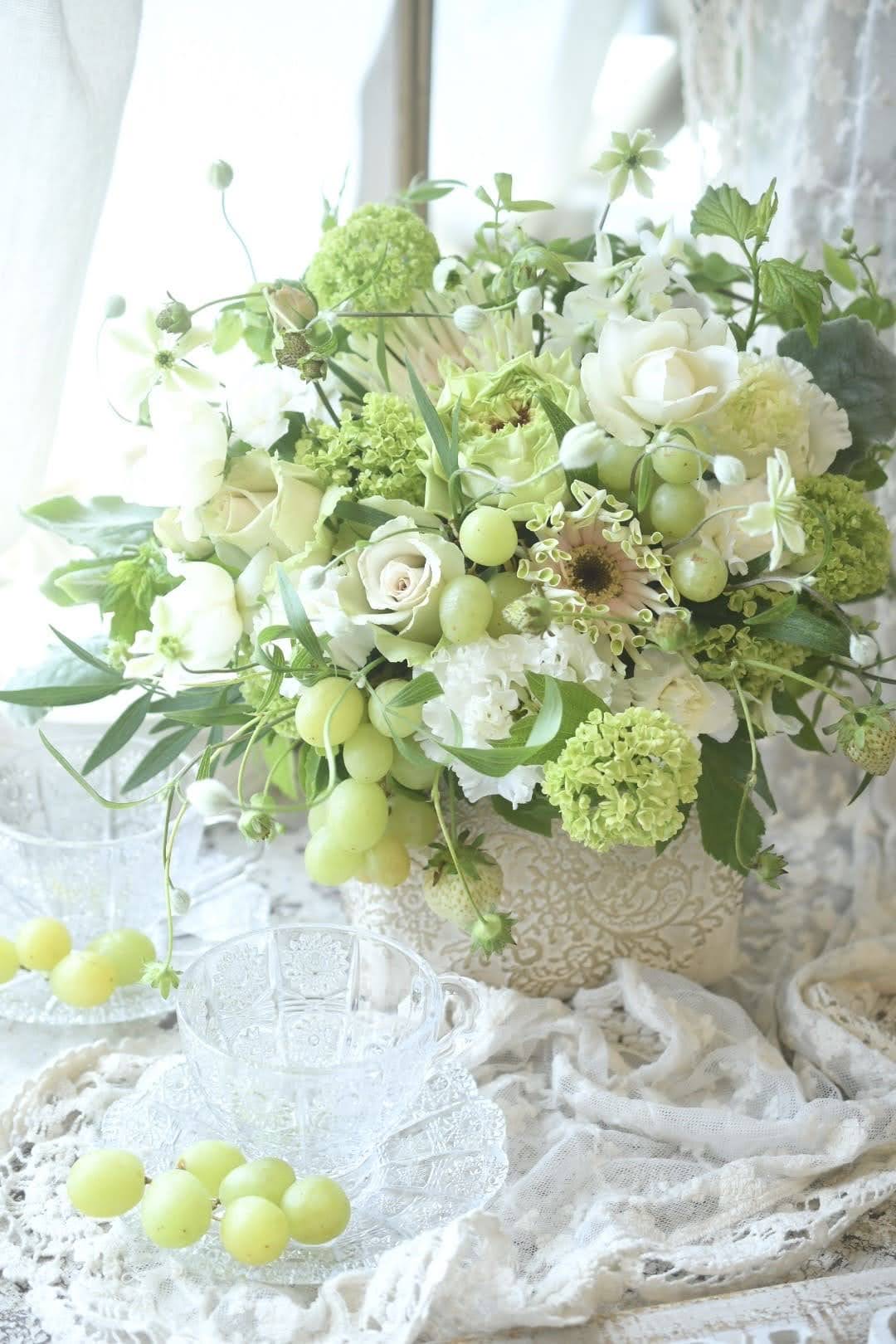 写真は、昨日のプライベートクラスで作った、フレッシュグリーンマスカットアレンジになります。