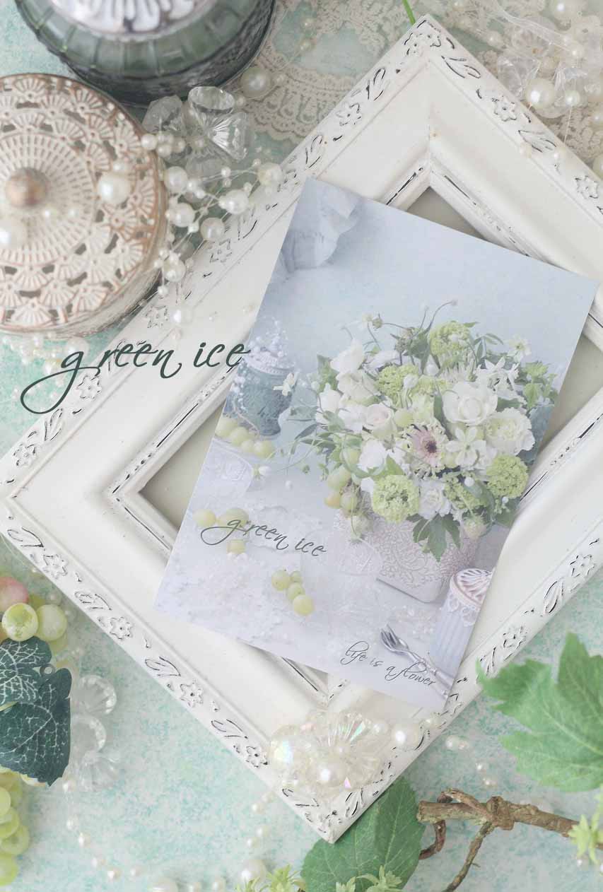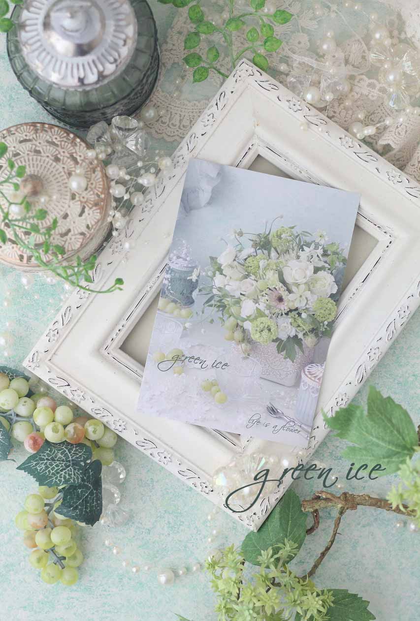 今日の写真は、新発売のポストカードの2種類目、グリーンマスカットアレンジになります。