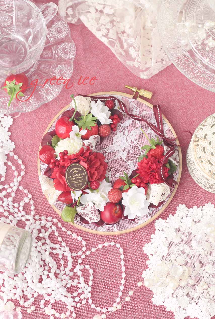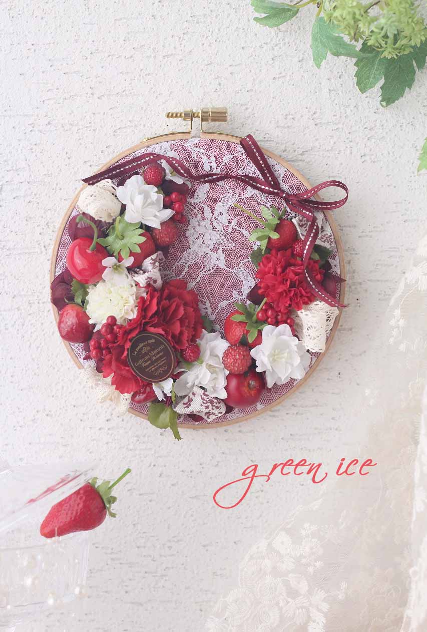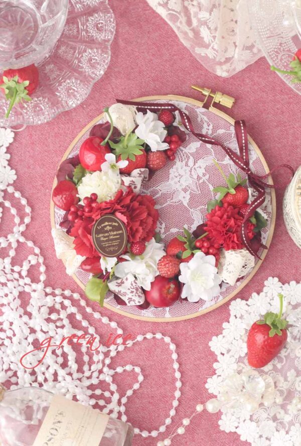今日の写真は、先日、レッドの集合写真の中央に映っていた、刺繍枠のレッドフラワーリース<中サイズ>になります。