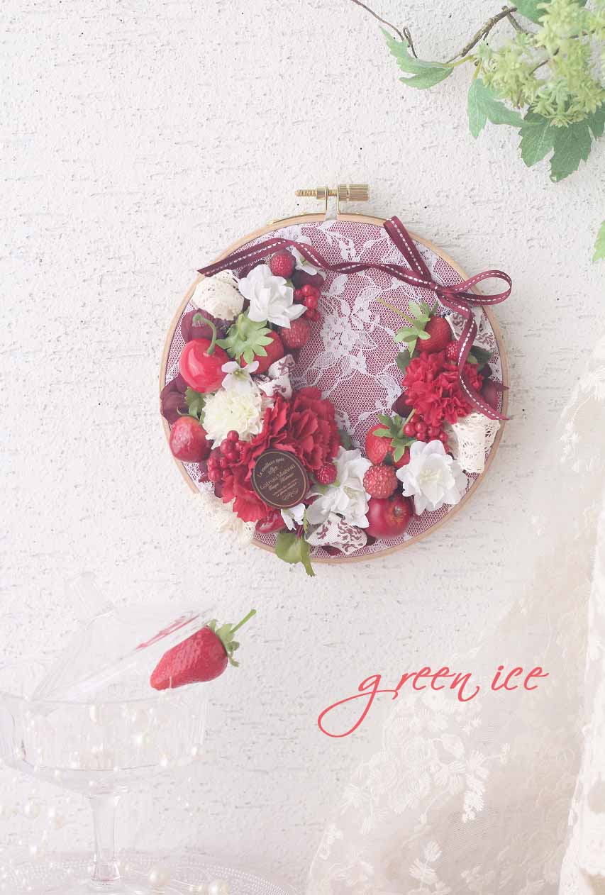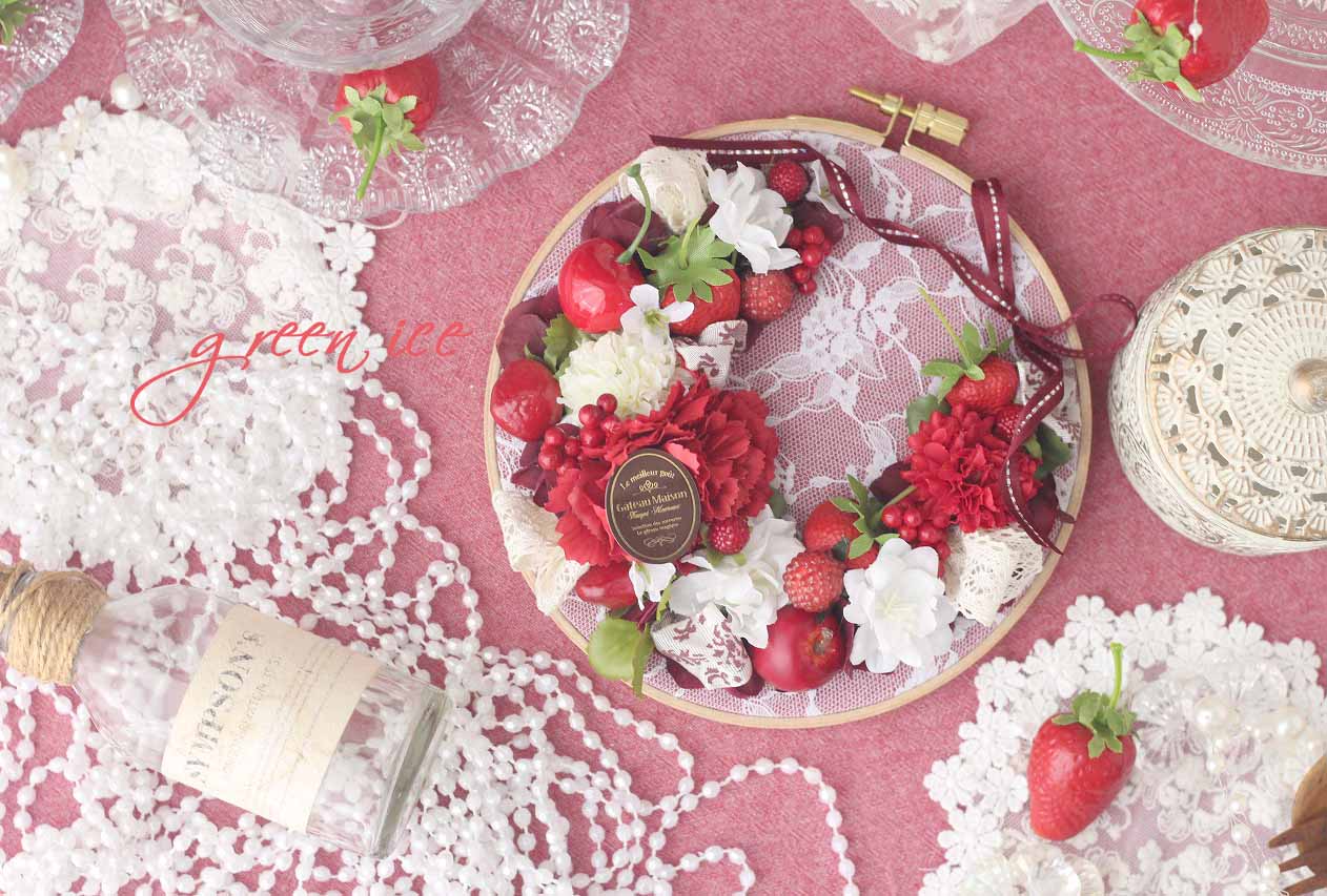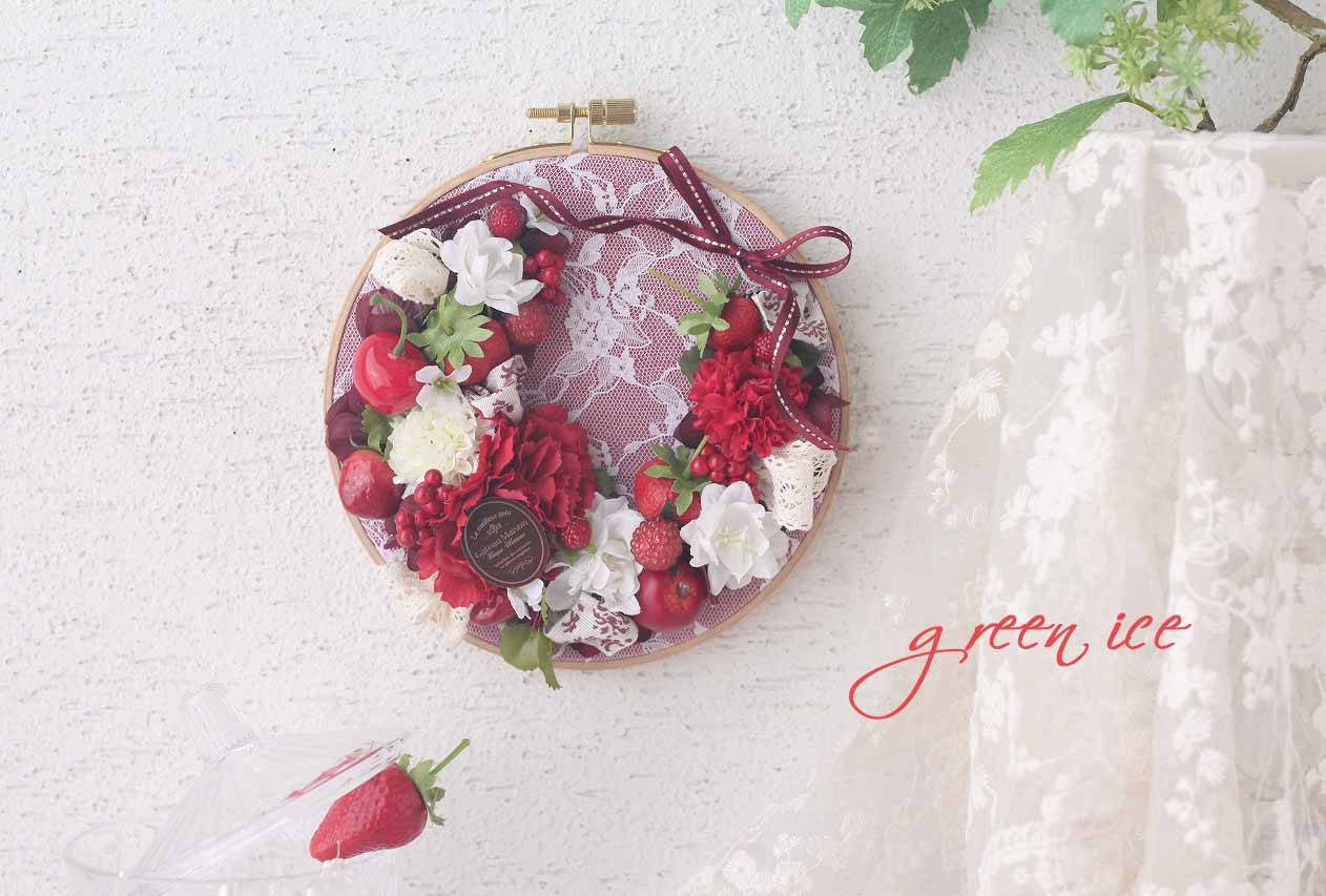 刺繍枠のレッドフラワーリース<中サイズ>