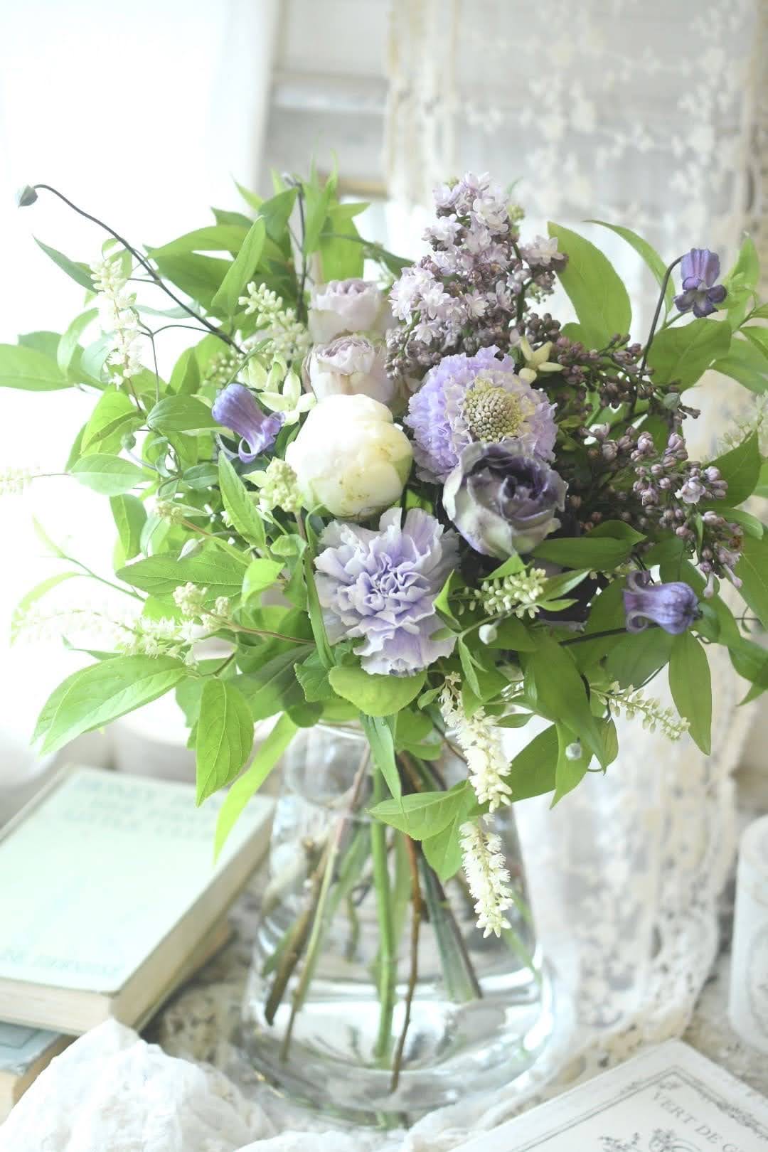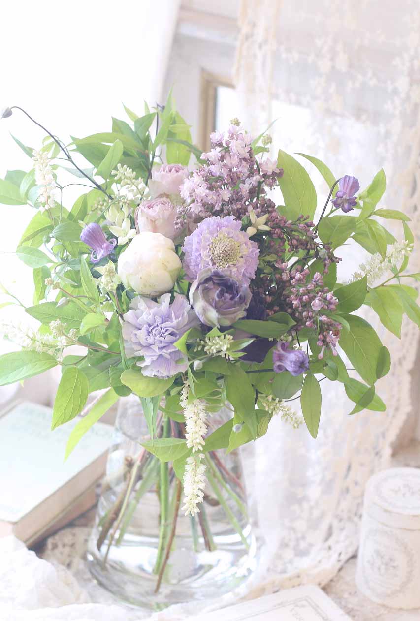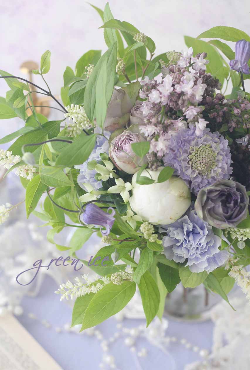 芍薬、ライラック、スカビオサ、ローズ、クレマチス、カーネーション、リョウブ、トルコキキョウなど組み合わせています。