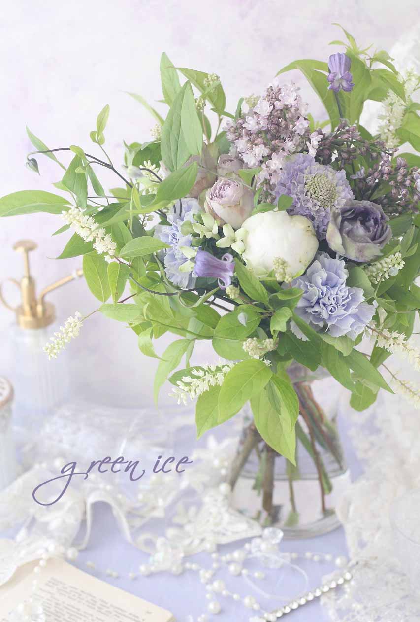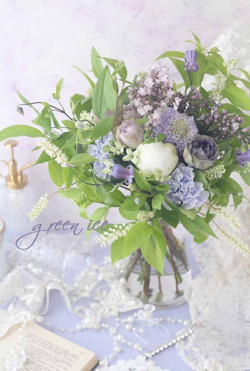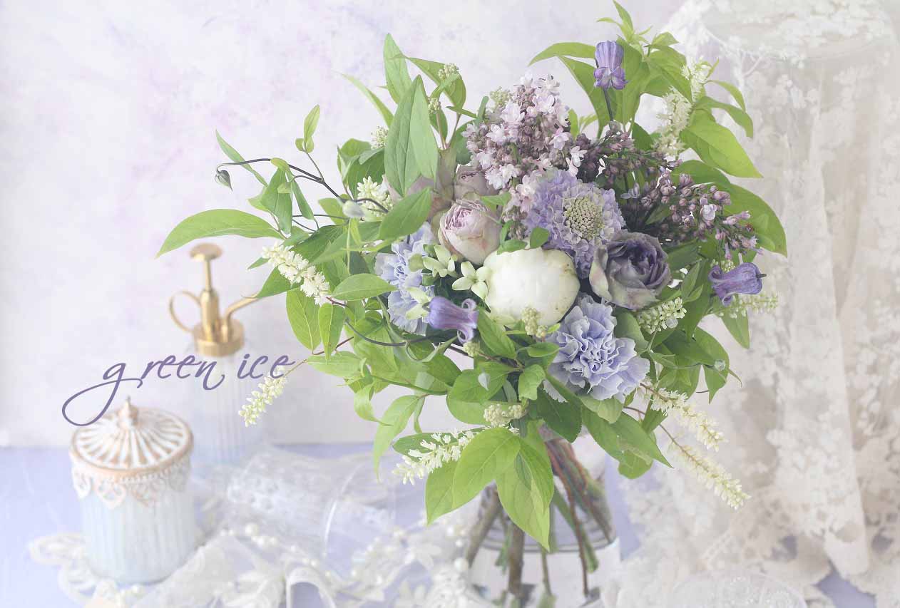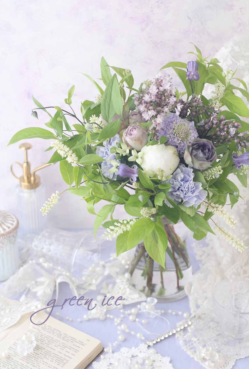 芍薬、ライラック、スカビオサ、ローズ、クレマチス、カーネーション、リョウブ、トルコキキョウなど組み合わせています。
