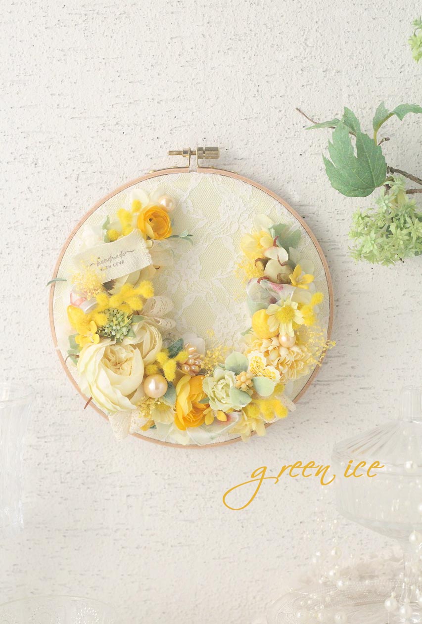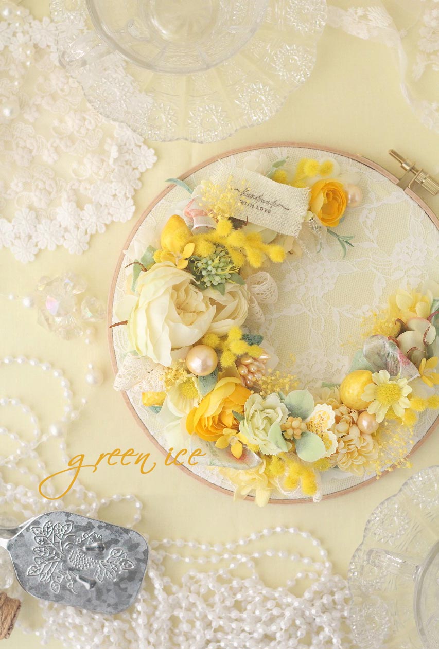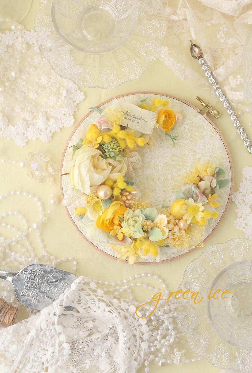 今日の写真は、刺繍枠のイエローフラワーリース<大サイズ>になります。