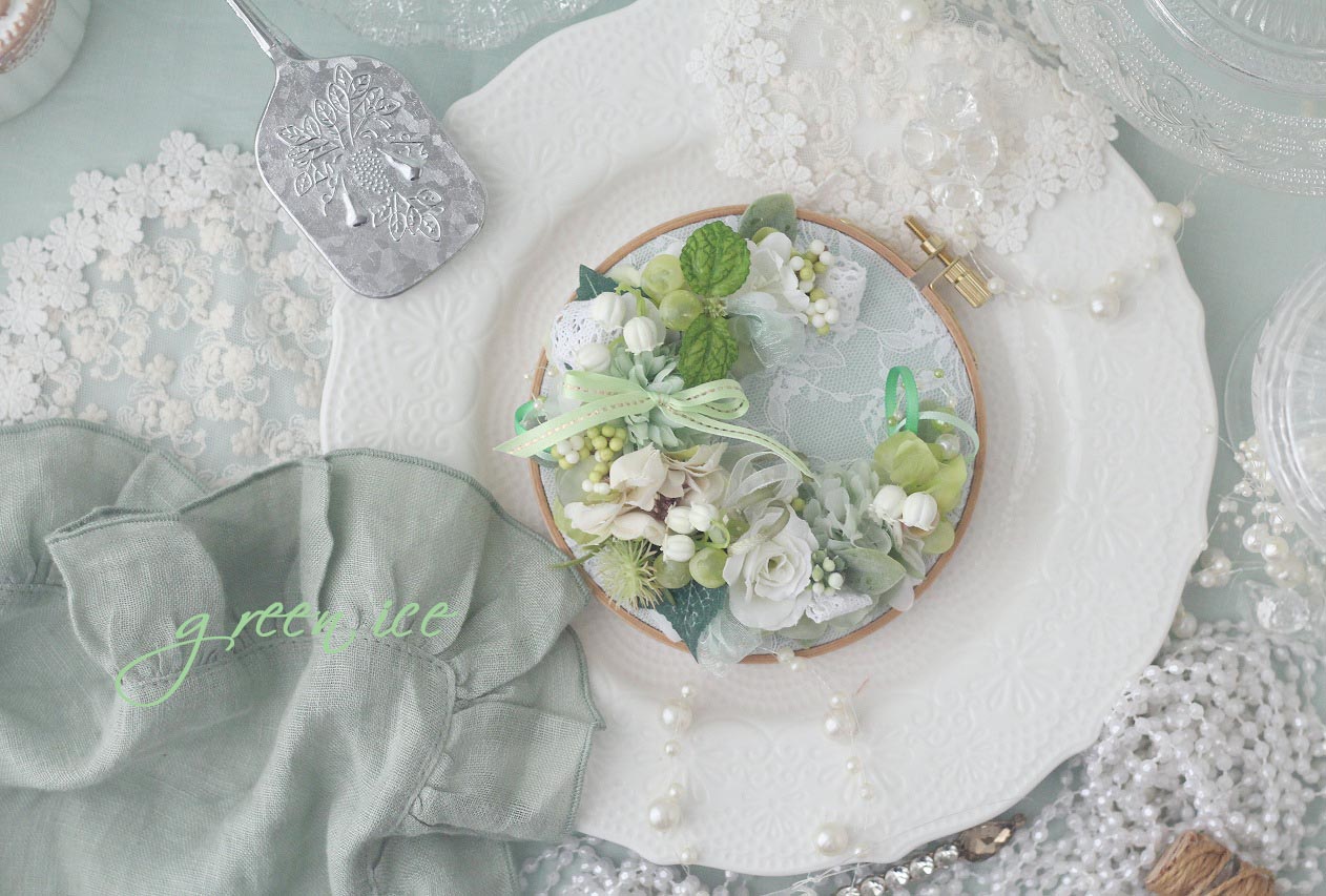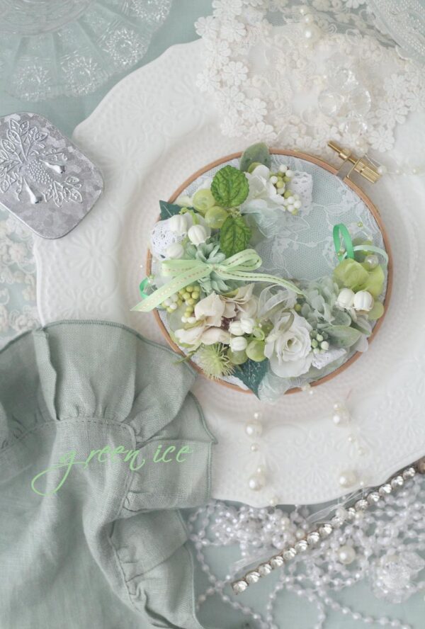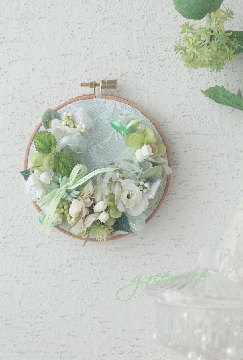 今日の写真は、オンラインショップ、ミンネさんにて販売中の、刺繍枠のグリーンフラワーリース<小サイズ>になります。