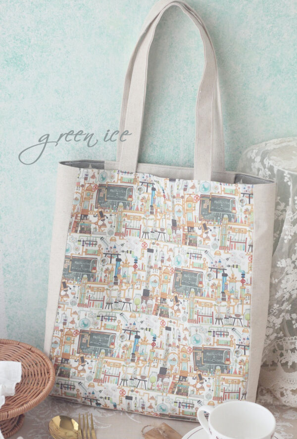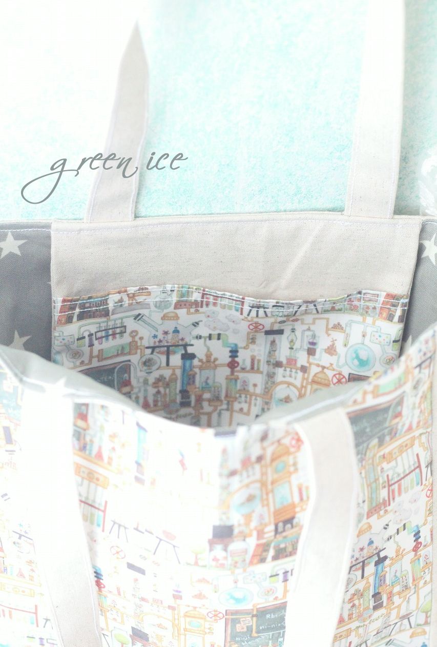 空想雑貨店さんの布で、トートバッグ、A4が入るマチ付き、ポケット付き、制作