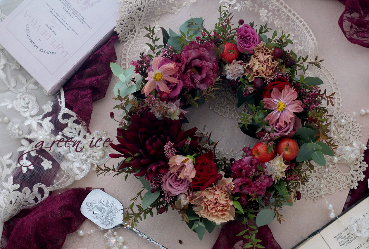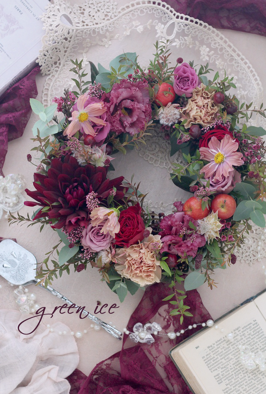 リースベースとお花は、こっくり秋色ピンクレッドをお願いしていて、生花でフラワーリースを作ってきました~