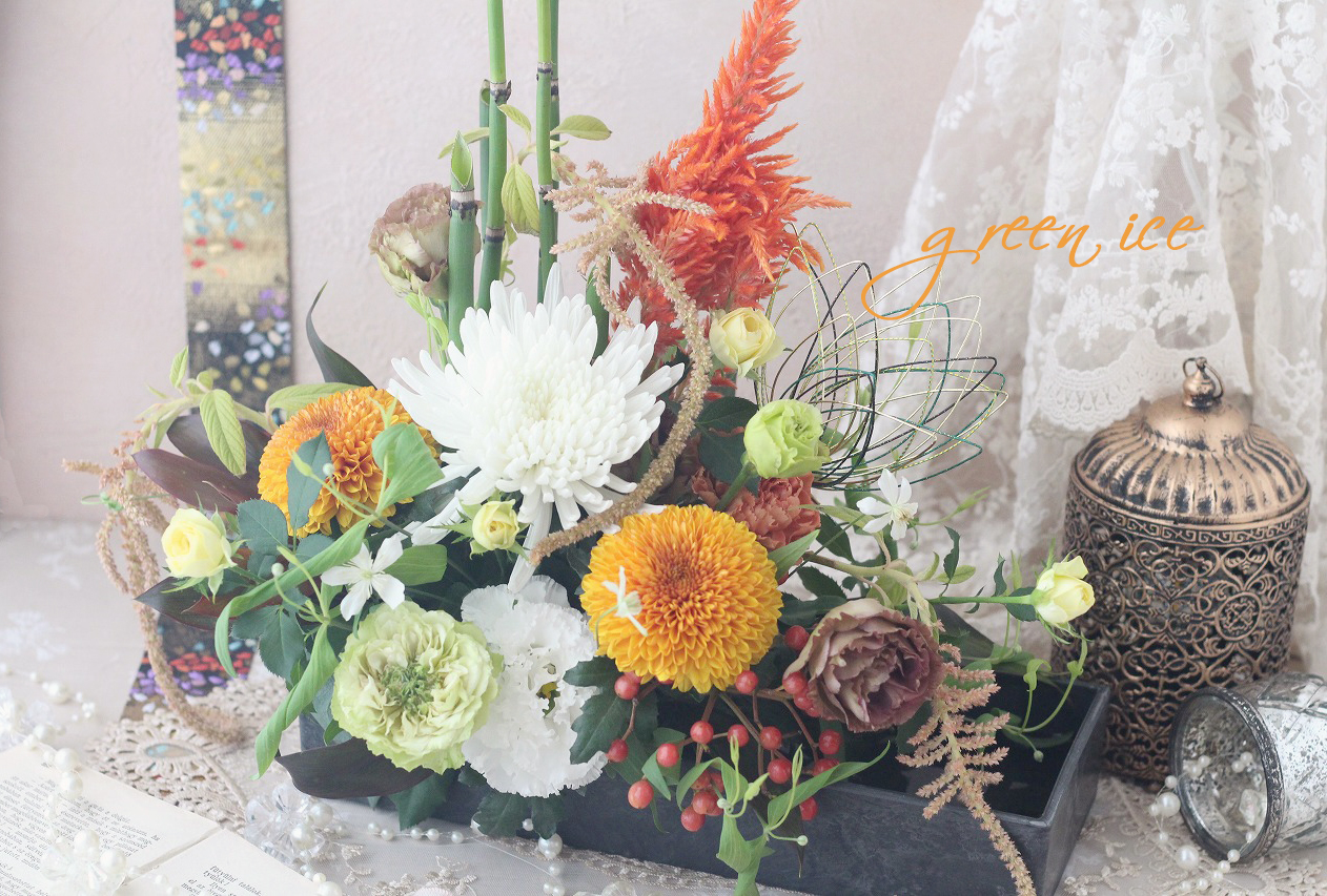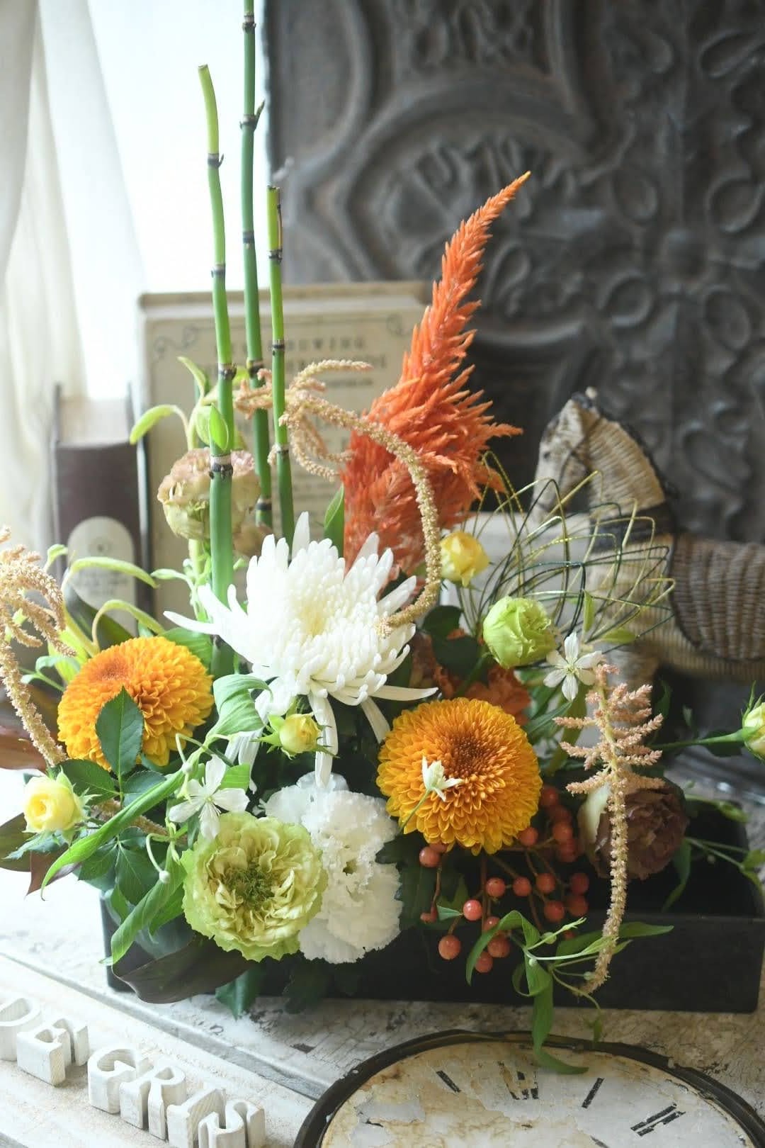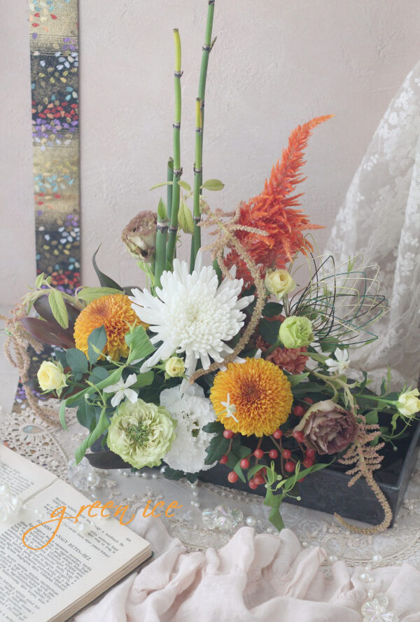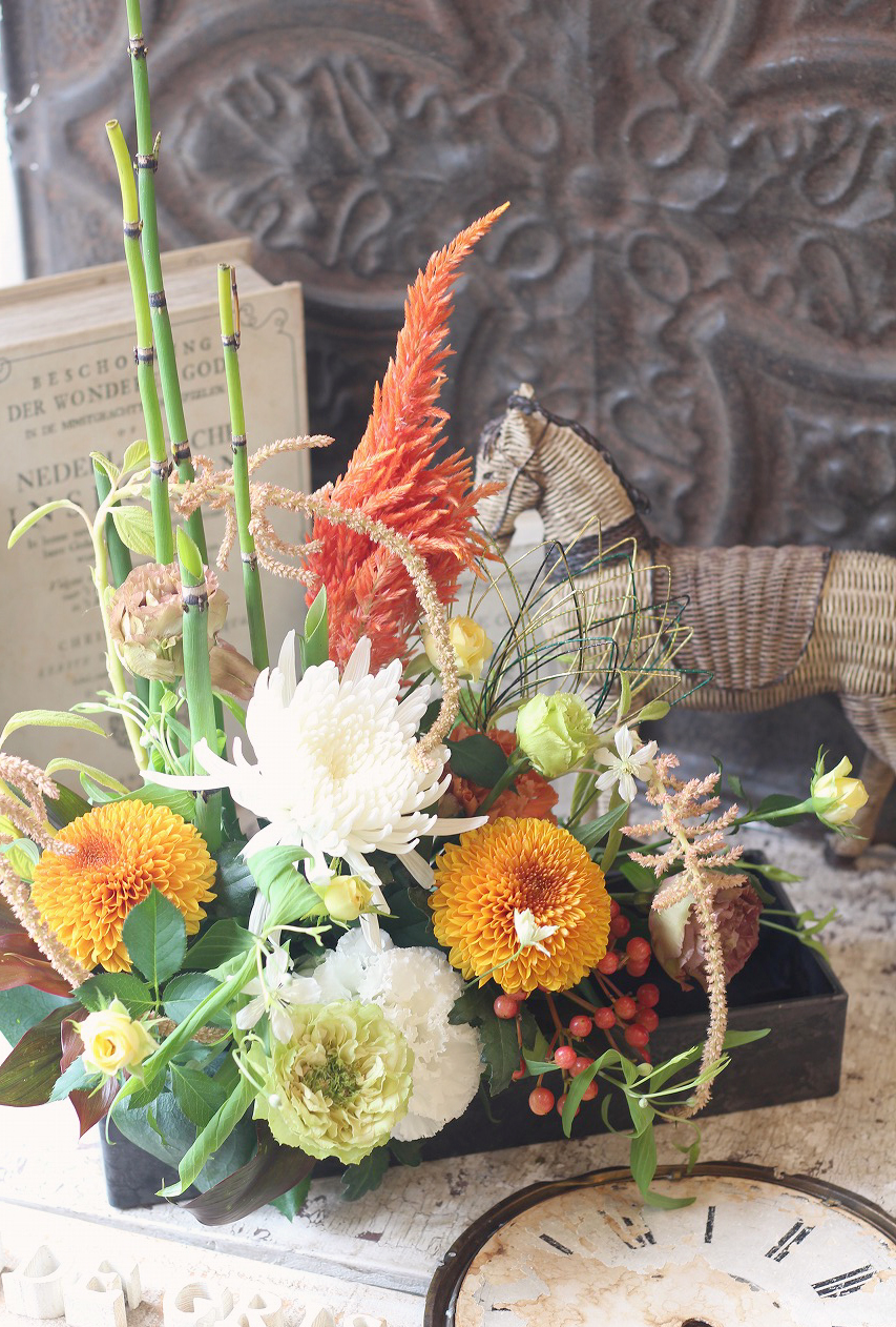 マム2種、バラ、トルコキキョウ、アマランサス、ケイトウ、スプレーバラ、カーネーション、クレマチスジュエル、ドラセナ、トクサなどを組み合わせて作っています。