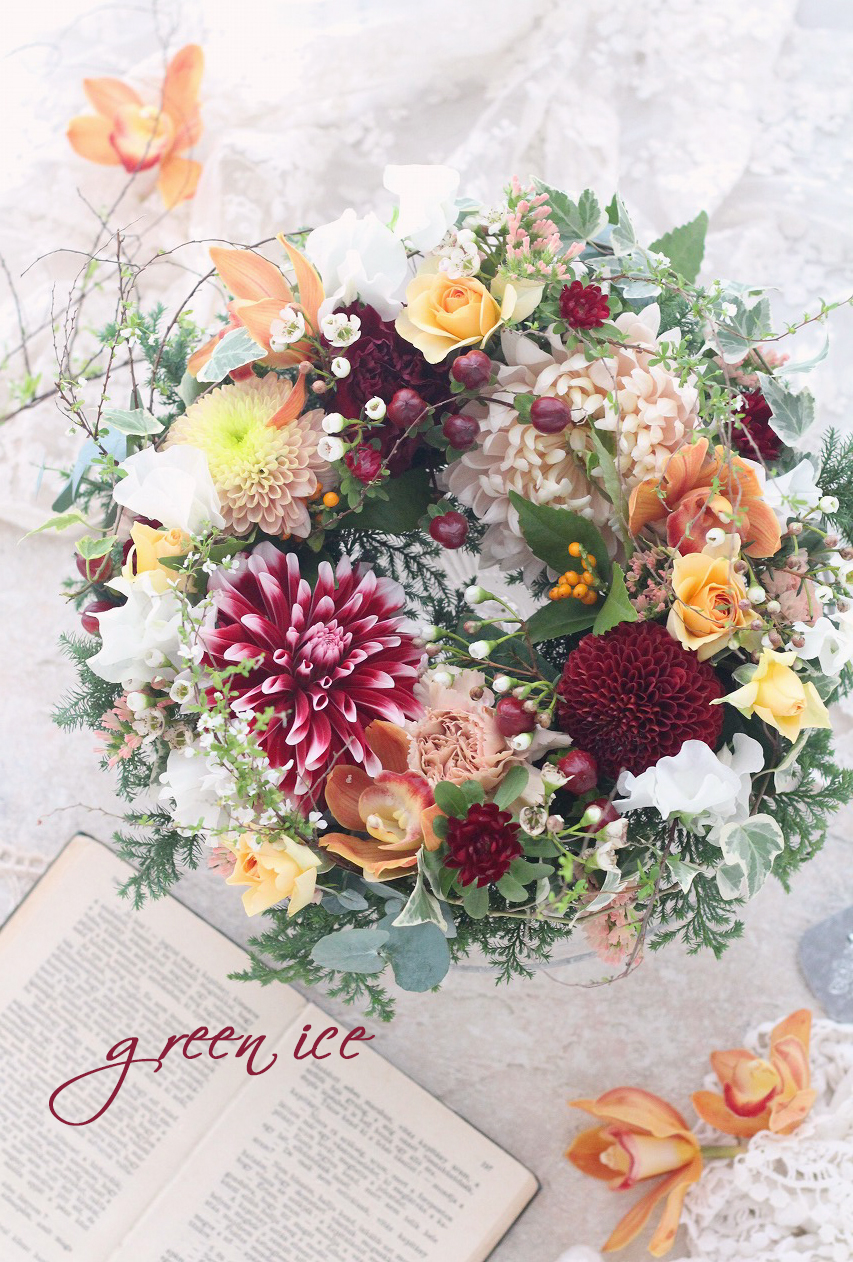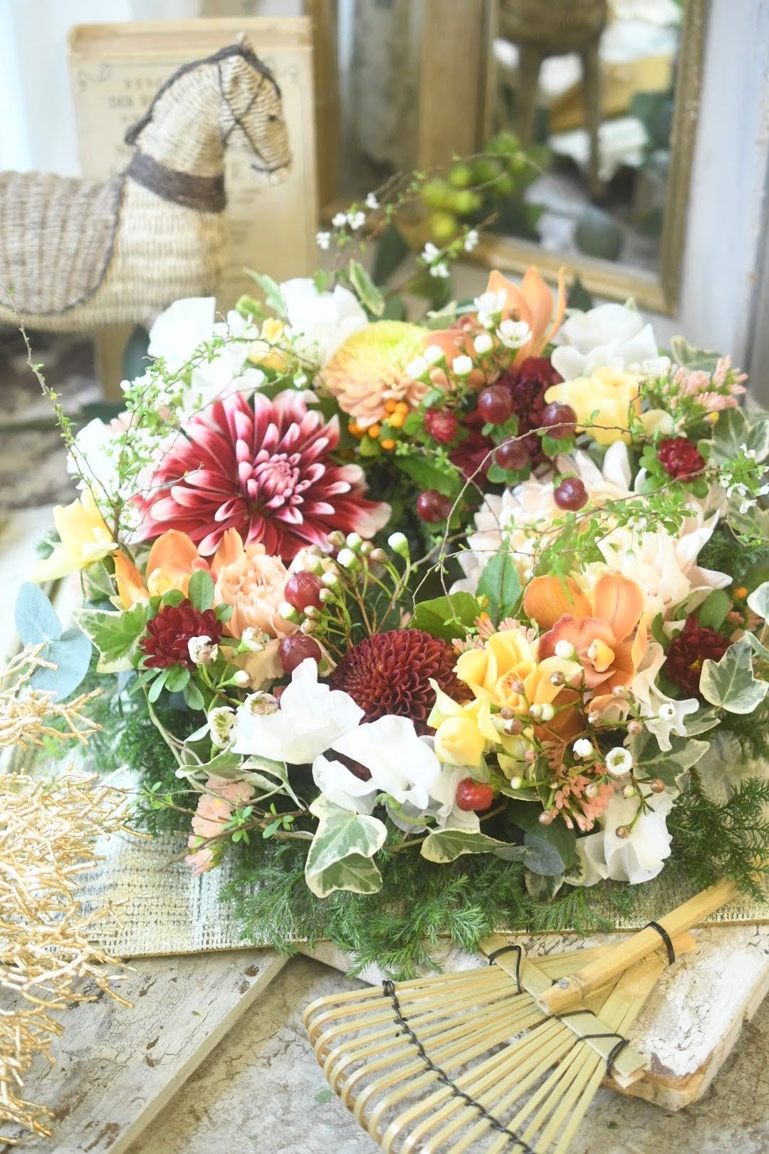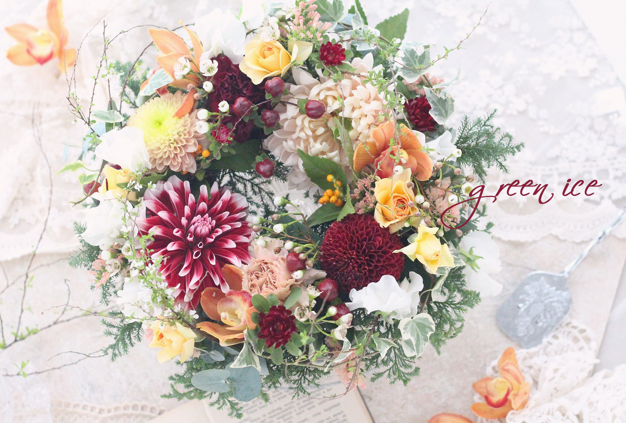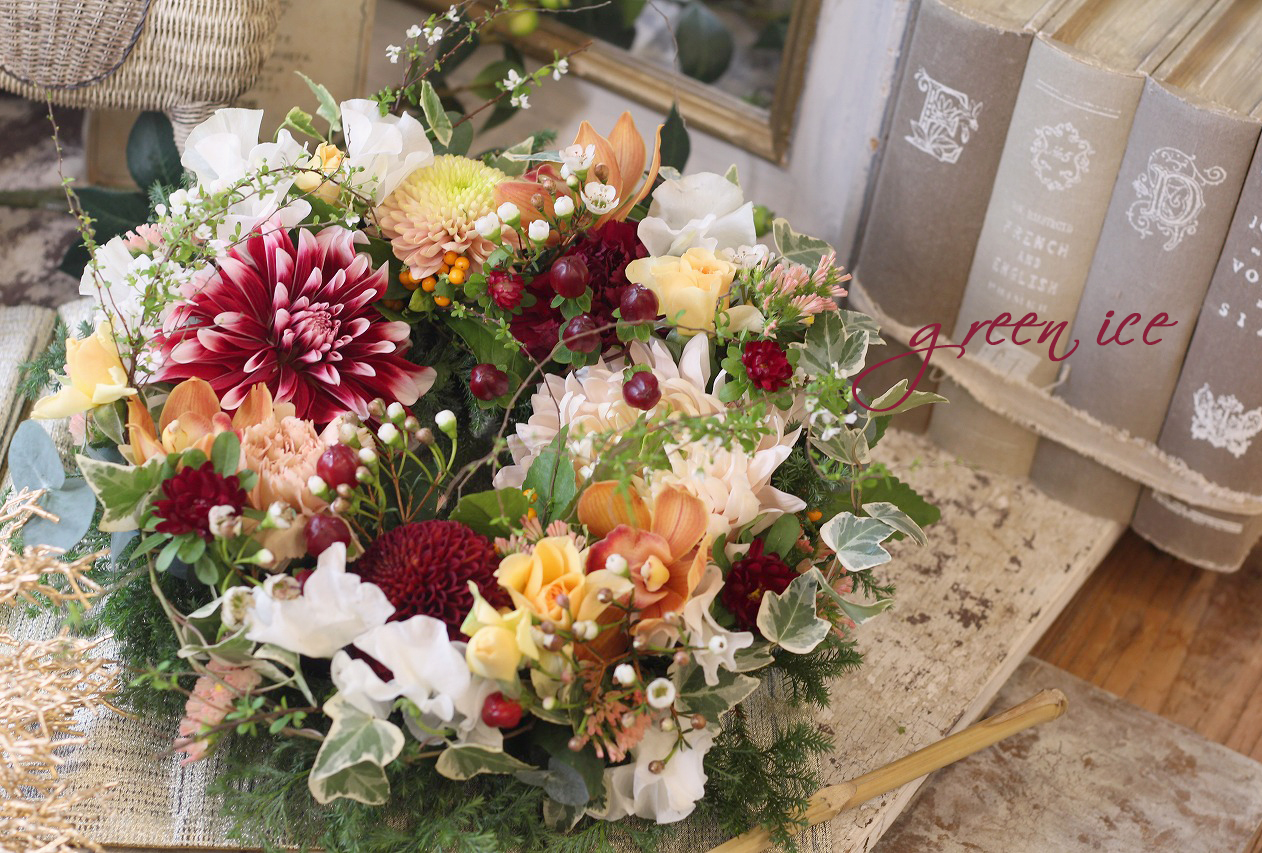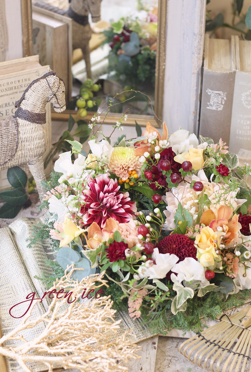 ダリア、マム、ラン、スプレーバラ、ヒペリカム、アスター、スイートピー、千両、ワックスフラワー、ユキヤナギ、ヒムロスギ、ユーカリ、スターチスなどを組み合わせて、リースにしています。