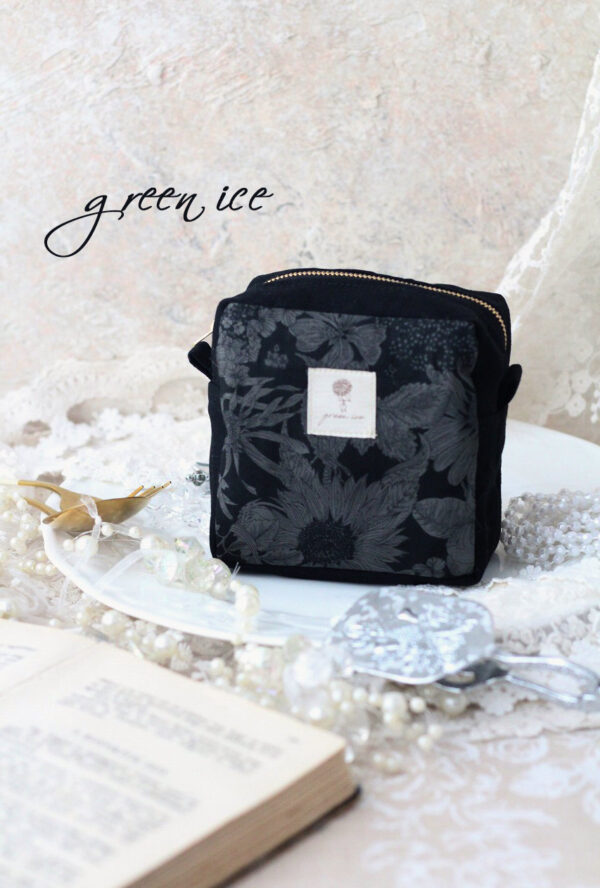 メインの両面の生地に、リバティ生地のスイム・ダンクレア柄(カラー・ブラック)を使用しています。