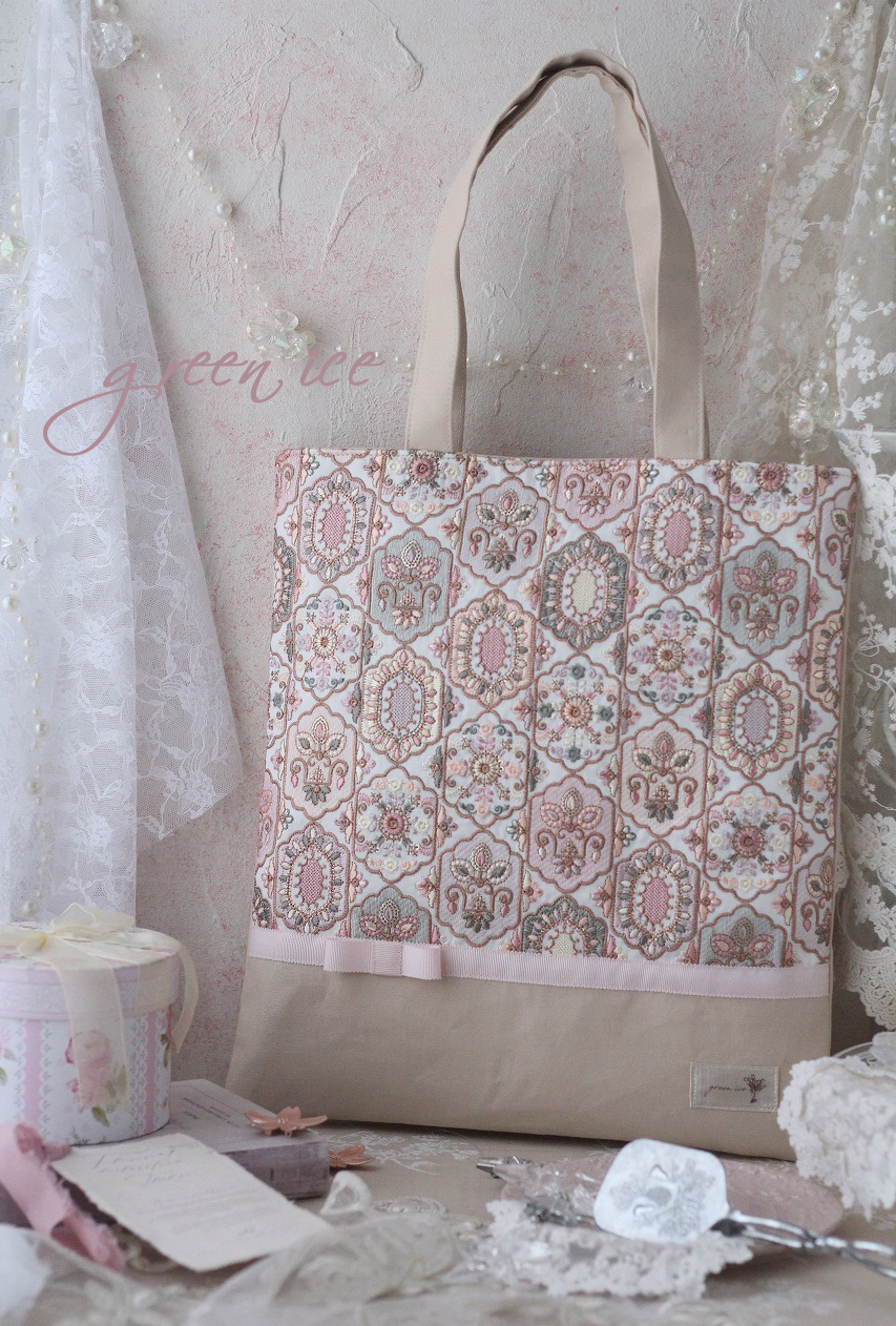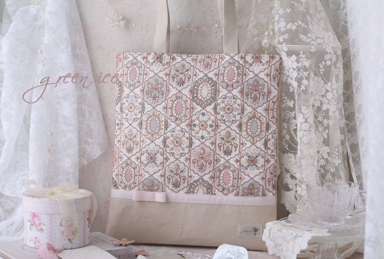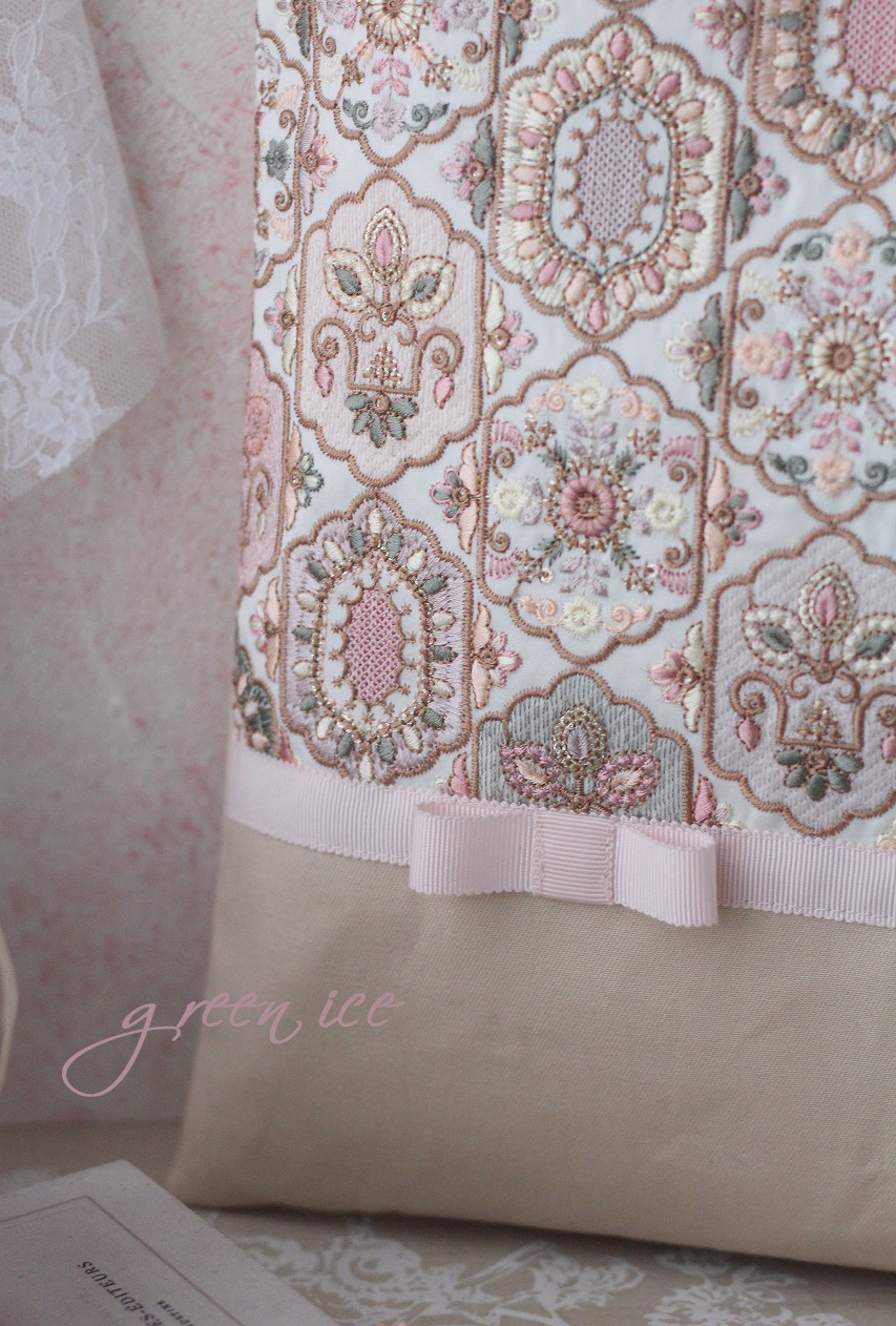 メインの表面の生地に、インド刺繍リボン生地のフェアリードリーム柄(カラー・ピンク)を使用しています。