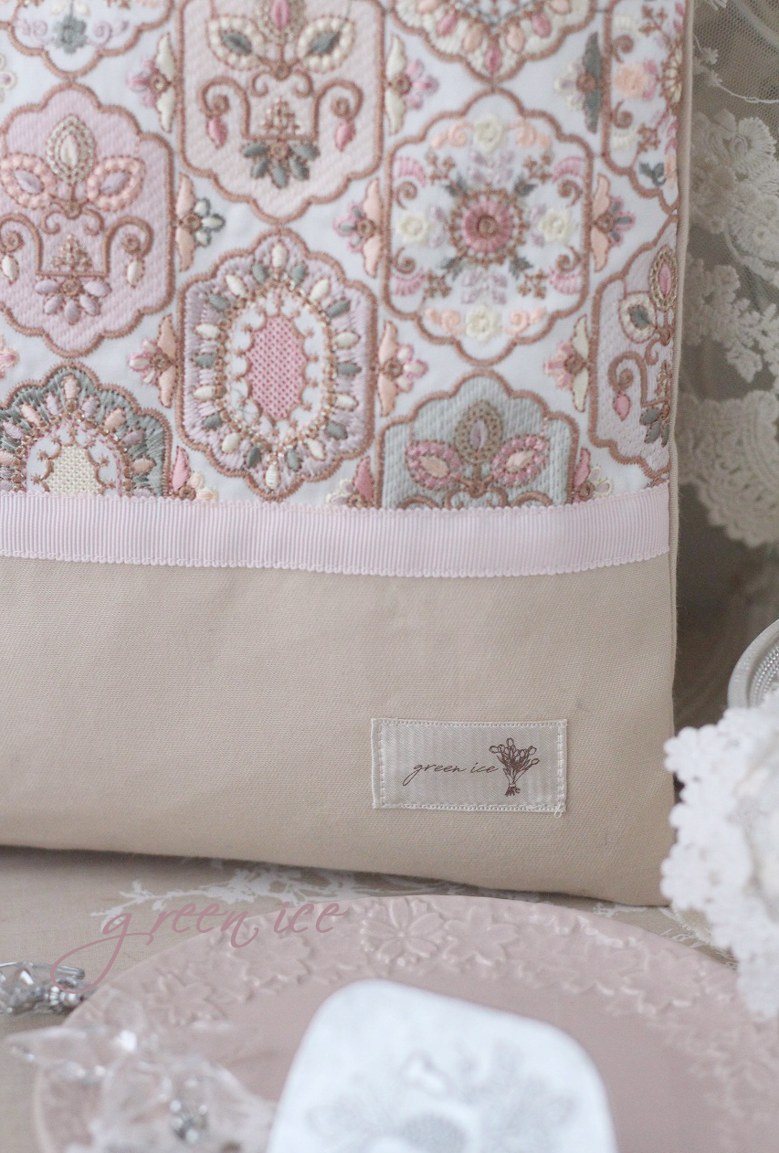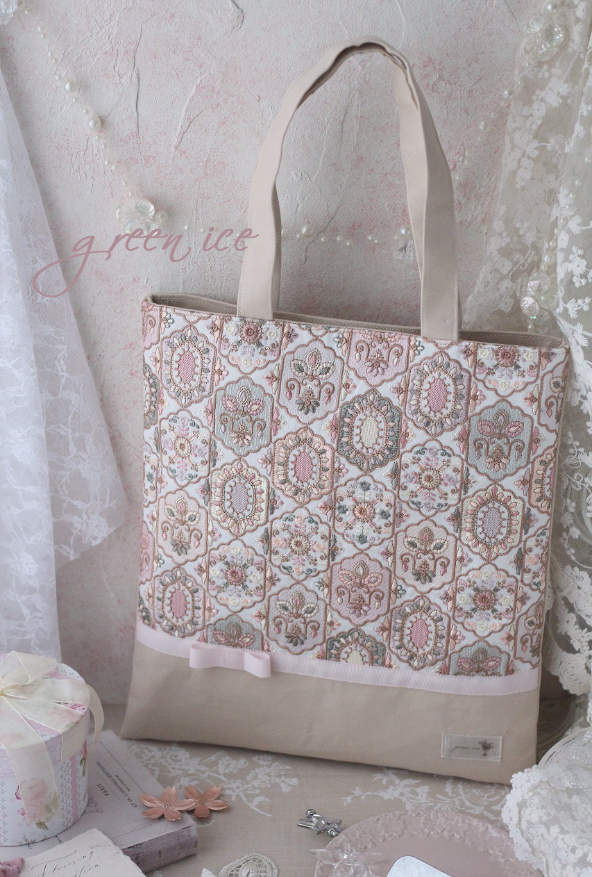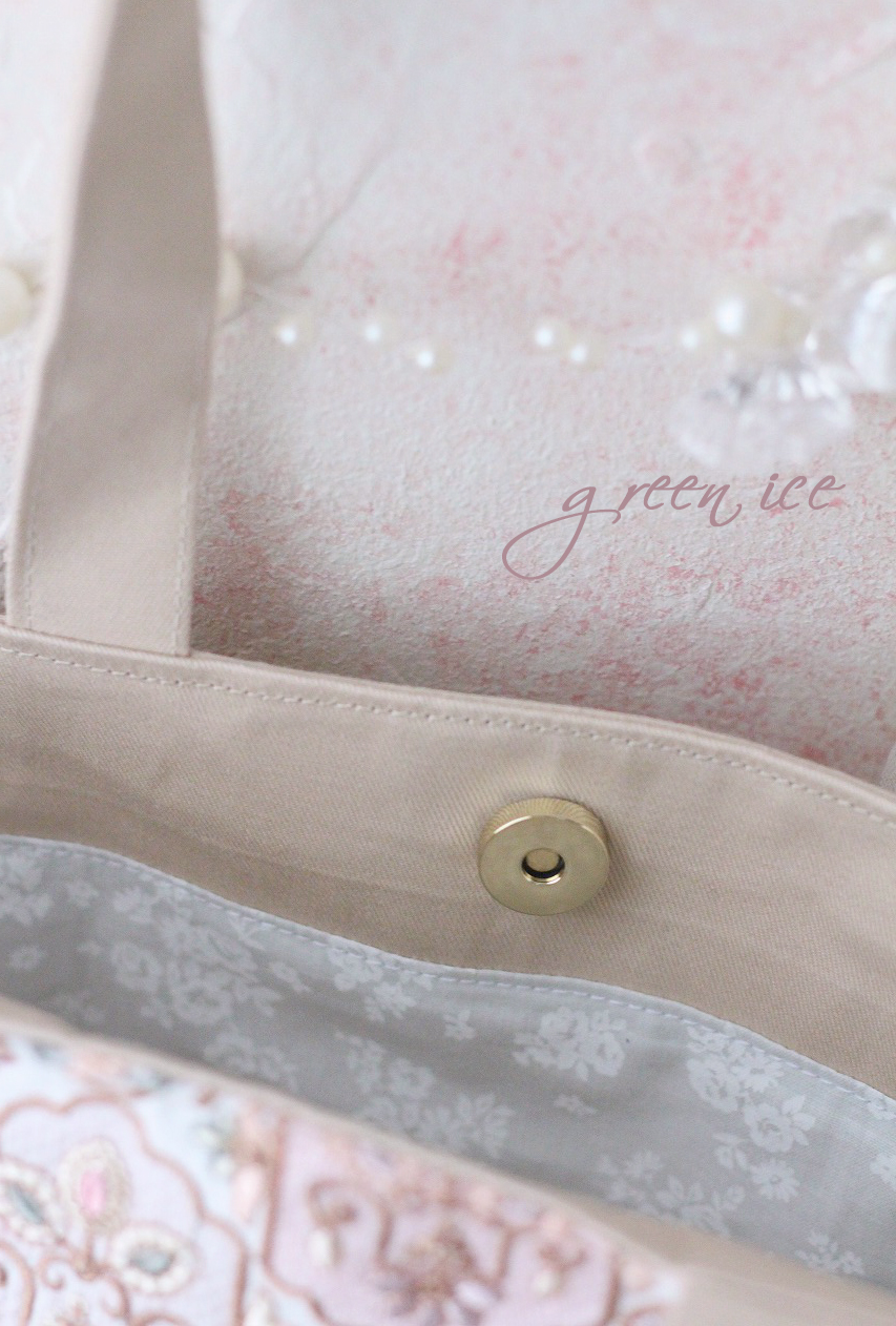 メインの表面の生地に、インド刺繍リボン生地のフェアリードリーム柄(カラー・ピンク)を使用しています。