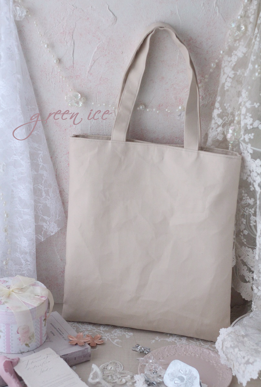 表面切り返し下側、裏面、見返し部分や持ち手は、ベージュの生地を使用しています。