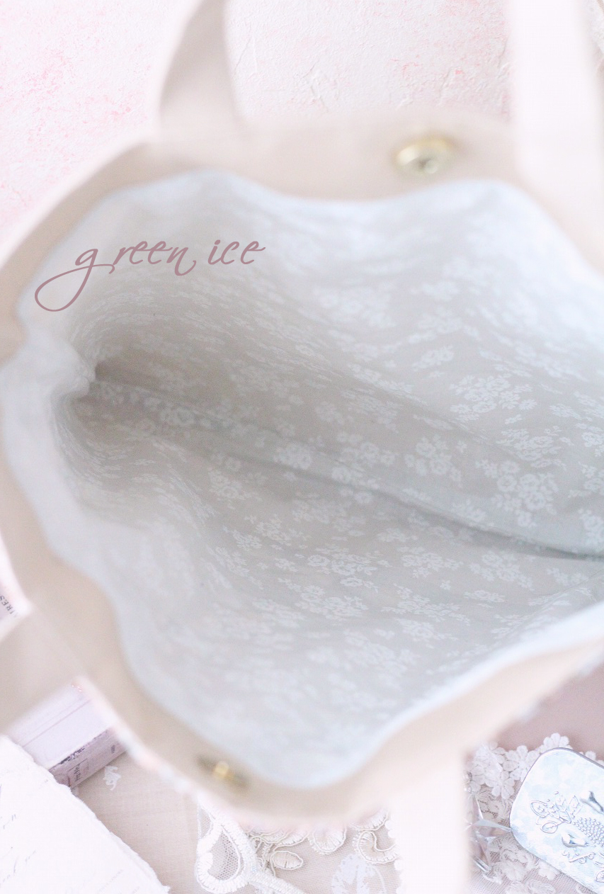 表がキラキラなので、中はシンプルに、ホワイトに花柄の生地を使っています。
