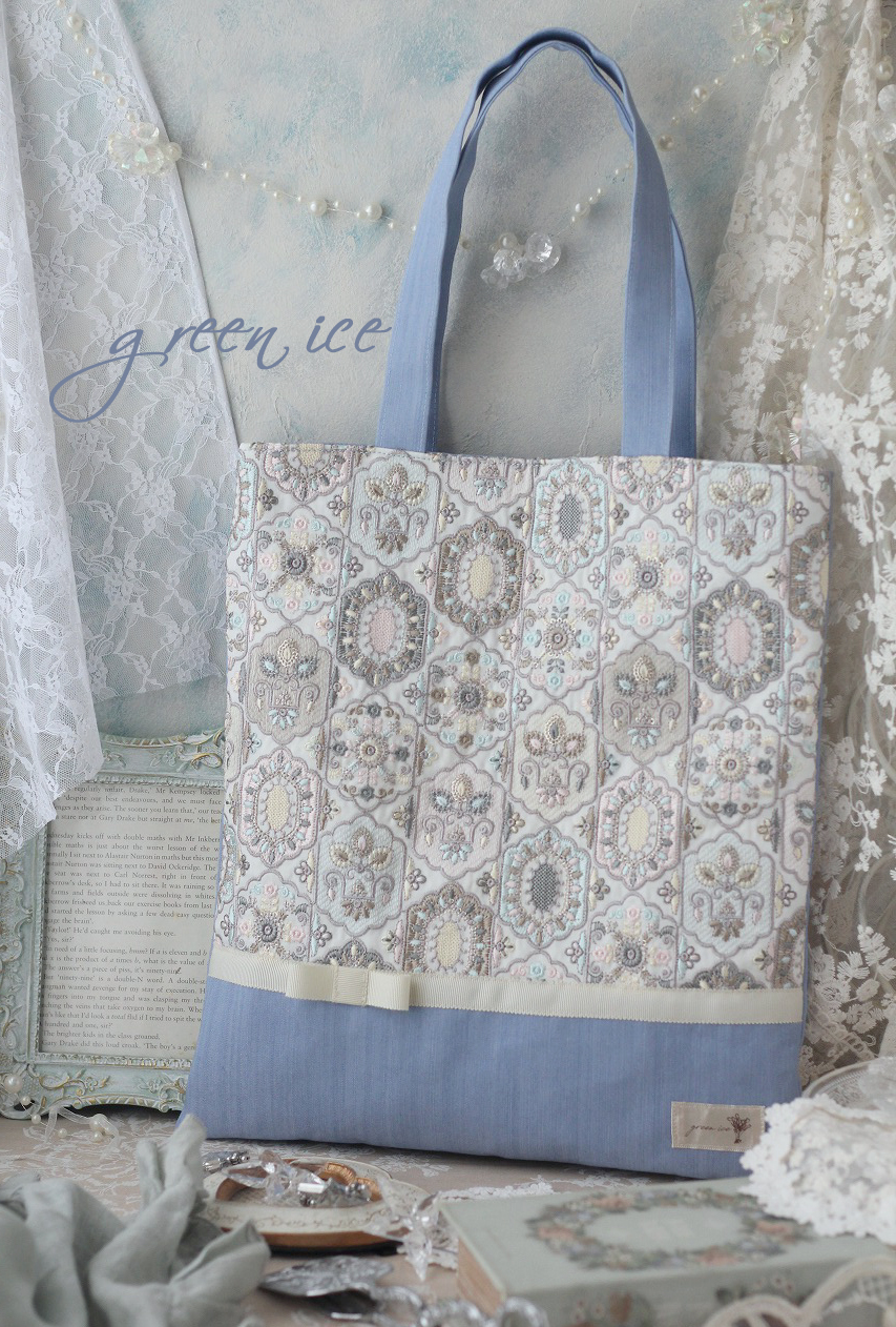 4. インド刺繍リボントートバッグ<フェアリードリーム>(アイスブルー)、販売開始しました♪