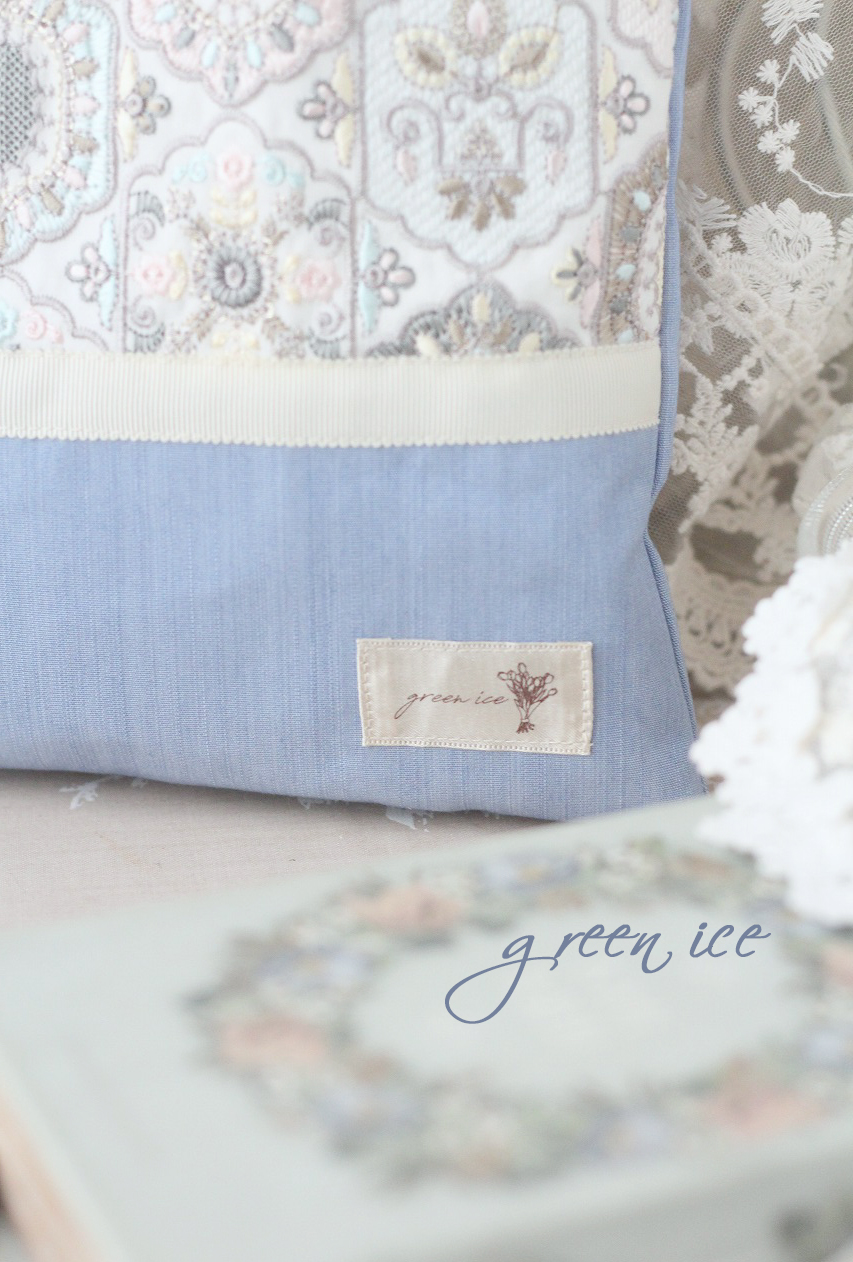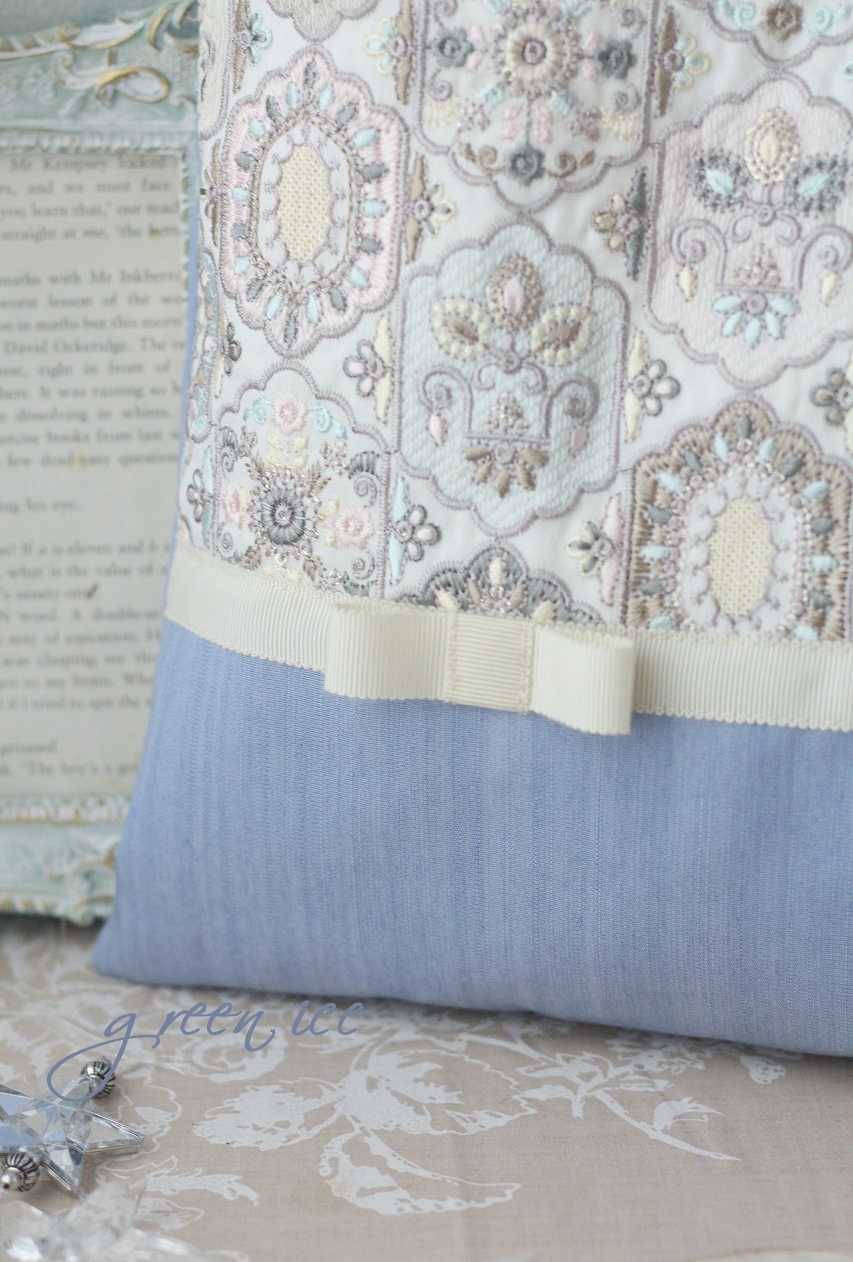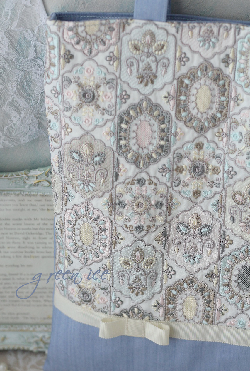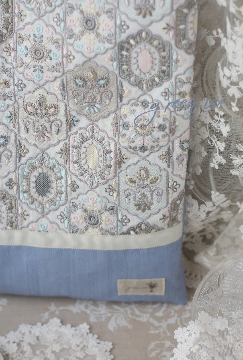 メインの表面の生地に、インド刺繍リボン生地のフェアリードリーム柄(カラー・アイスブルー)を使用しています。