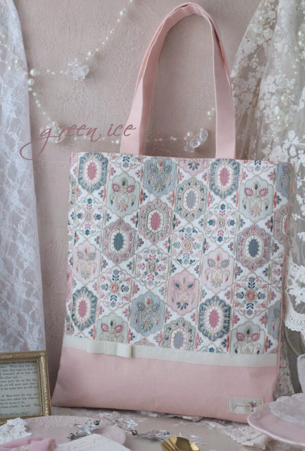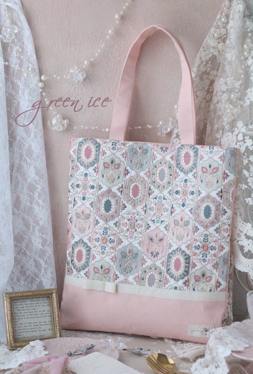 【インド刺繡リボントートバッグ<フェアリードリーム>(ピンクグリーン)】