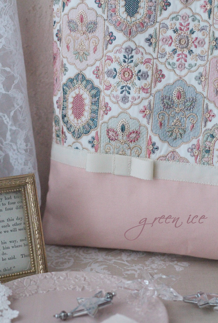 メインの表面の生地に、インド刺繍リボン生地のフェアリードリーム柄(カラー・グリーン)を使用しています。