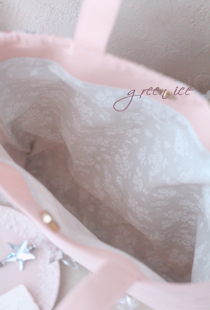 表面切り返し下側、裏面、見返し部分や持ち手は、ピンク色の生地を使用しています。