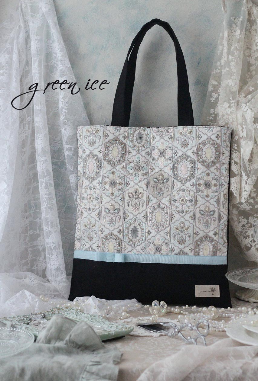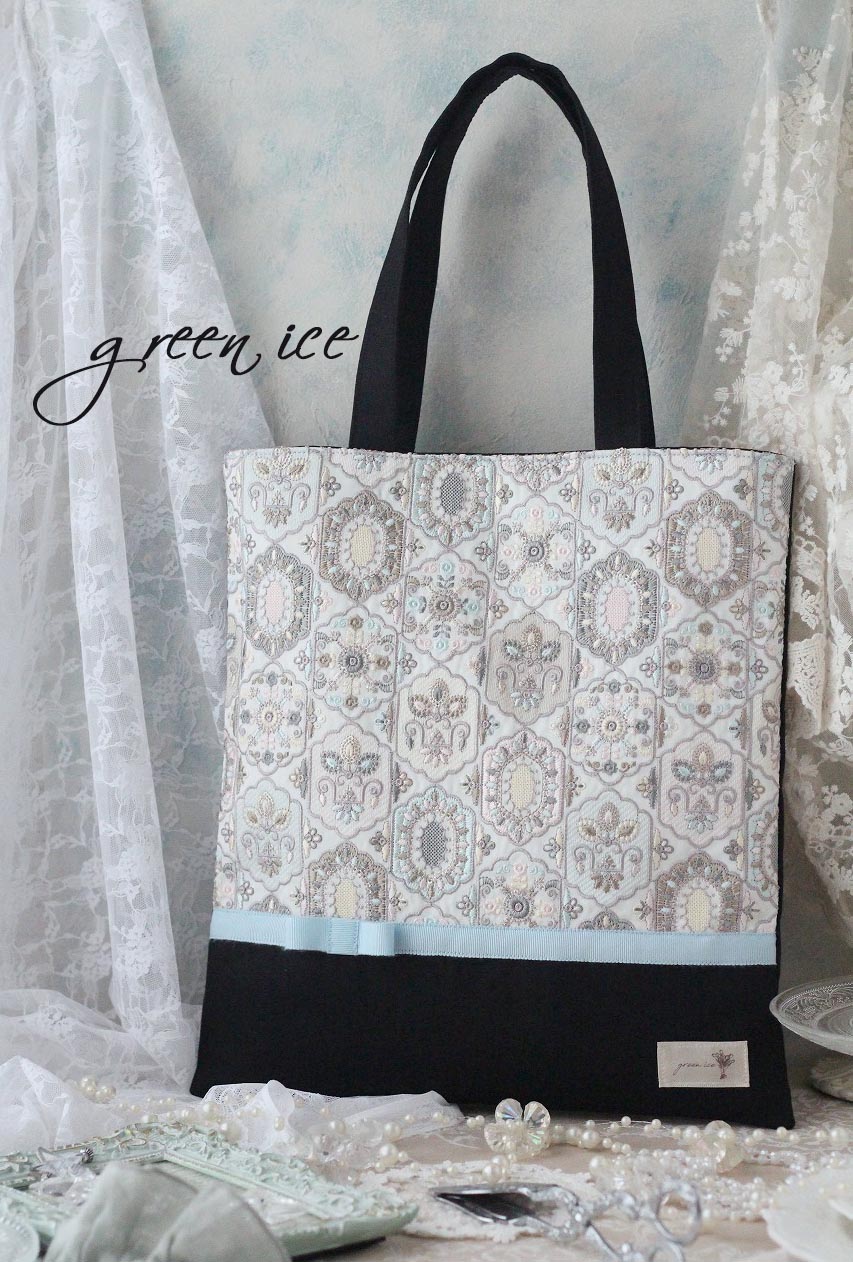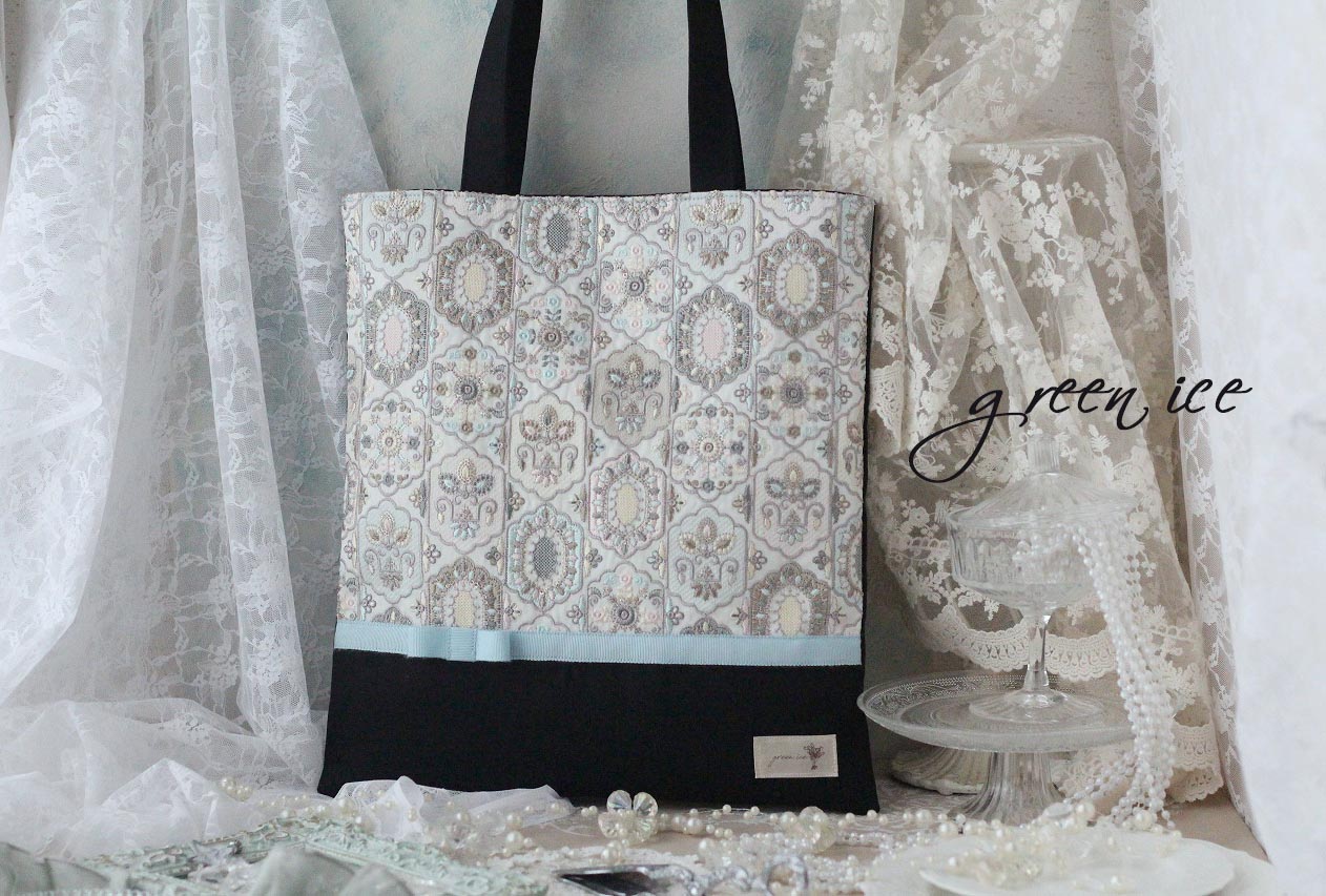 オーダー、インド刺繡リボントートバッグ<フェアリードリーム>(アイスブルー・ブラック)