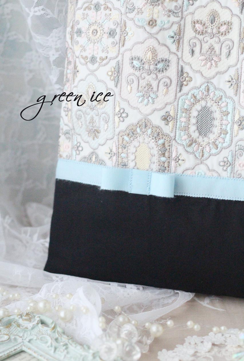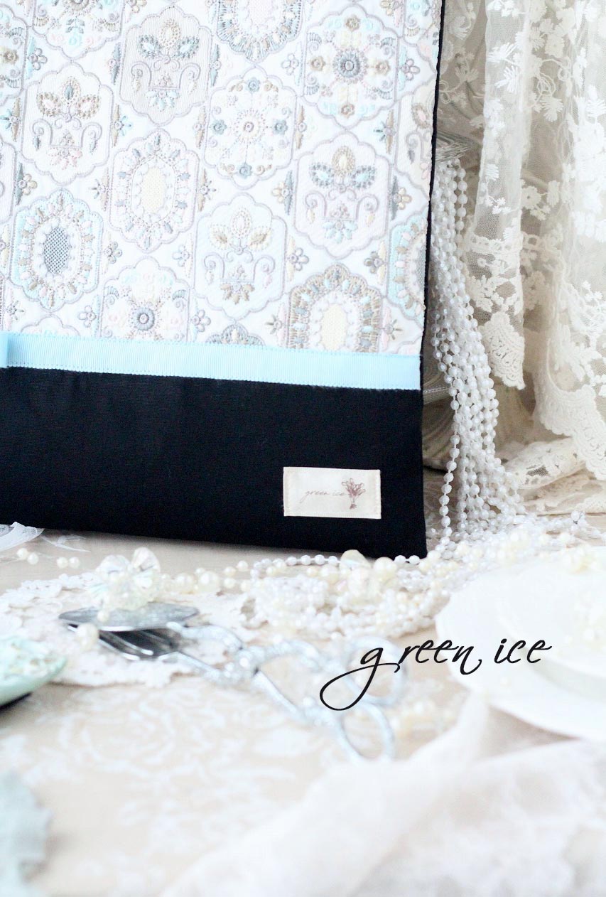 インド刺繍リボン生地のほうは、フェアリードリームという生地の、アイスブルーを使い、合わせる色を、ブラックでお作りさせていただいています。