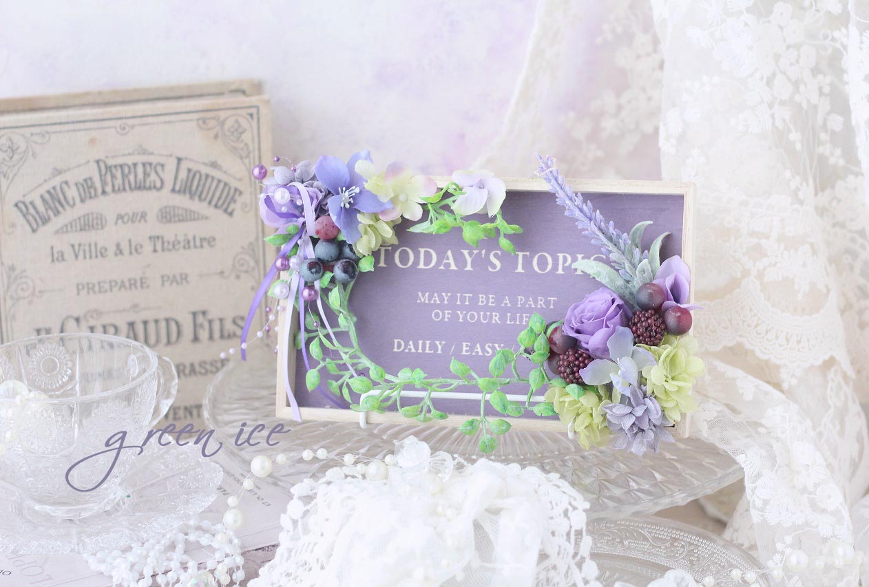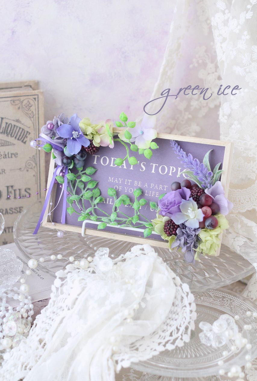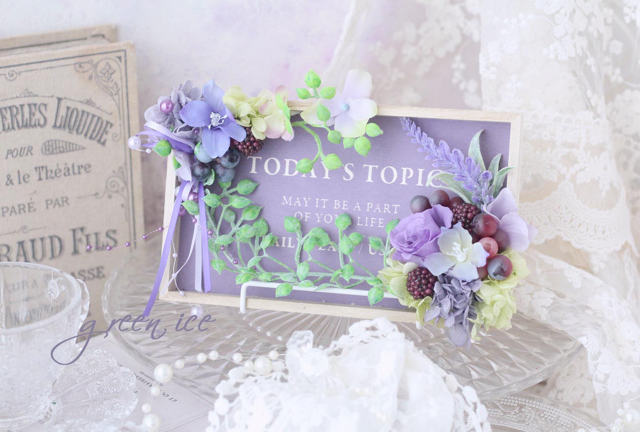 おしゃれな英文入りのパープルのウッドプレートに、プリザ・アートでお花をアレンジさせていただいています。