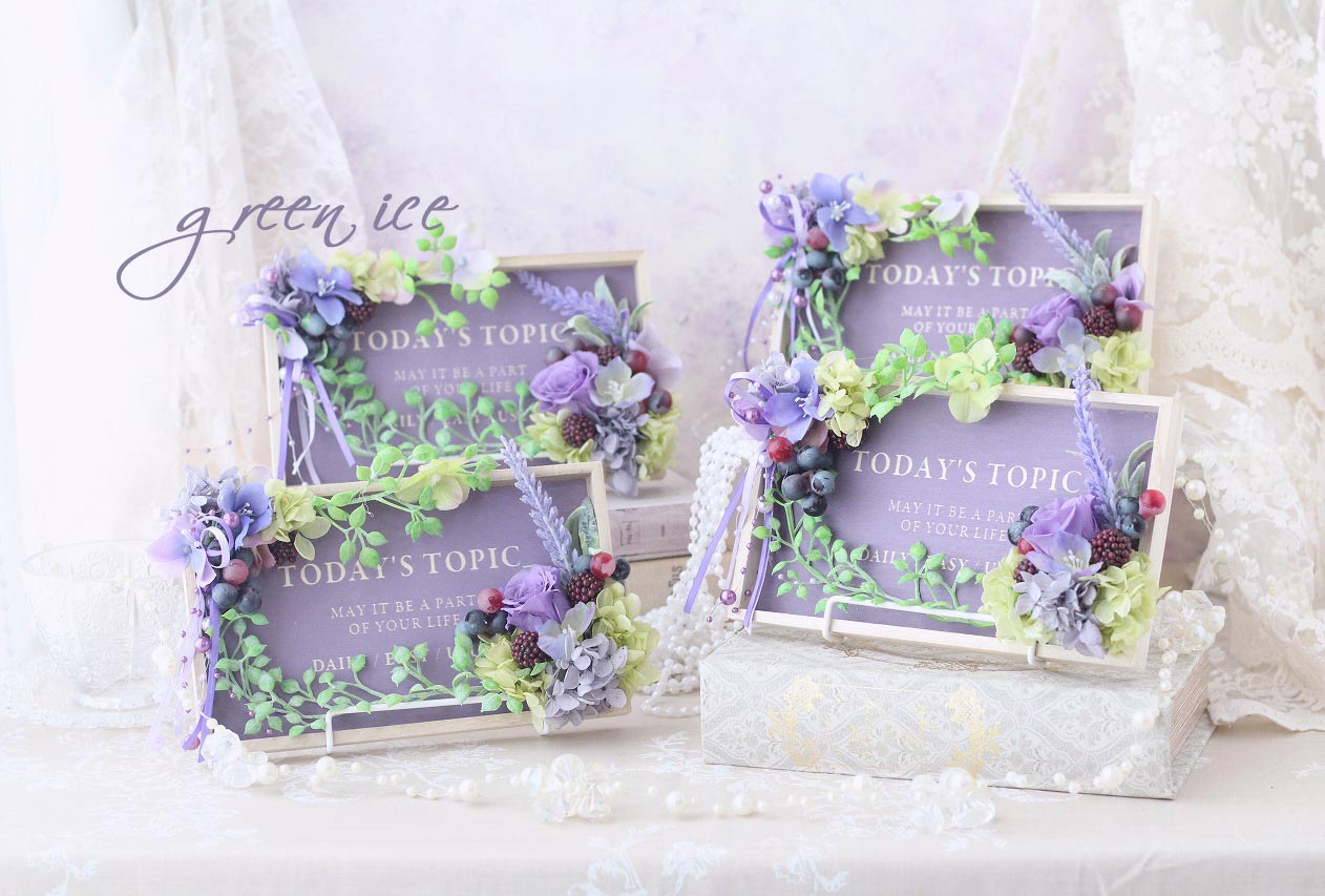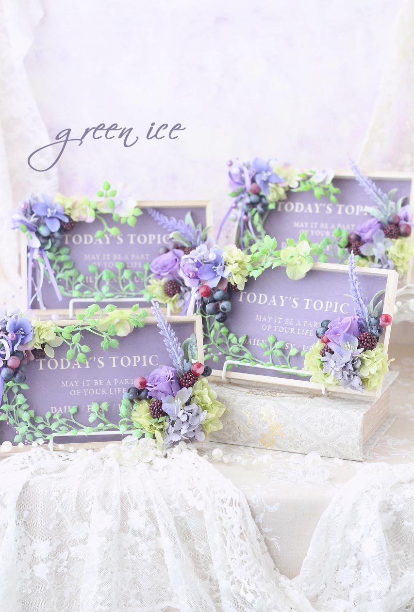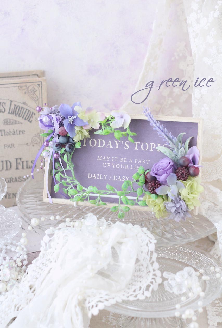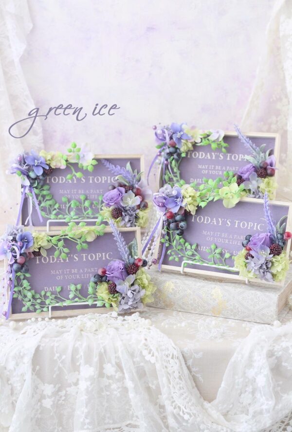 おしゃれな英文入りのパープルのウッドプレートに、プリザ・アートでお花をアレンジさせていただいています。