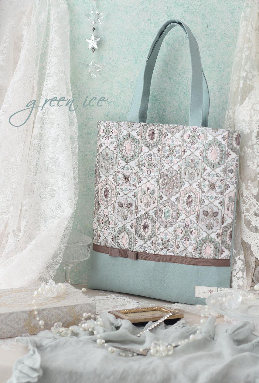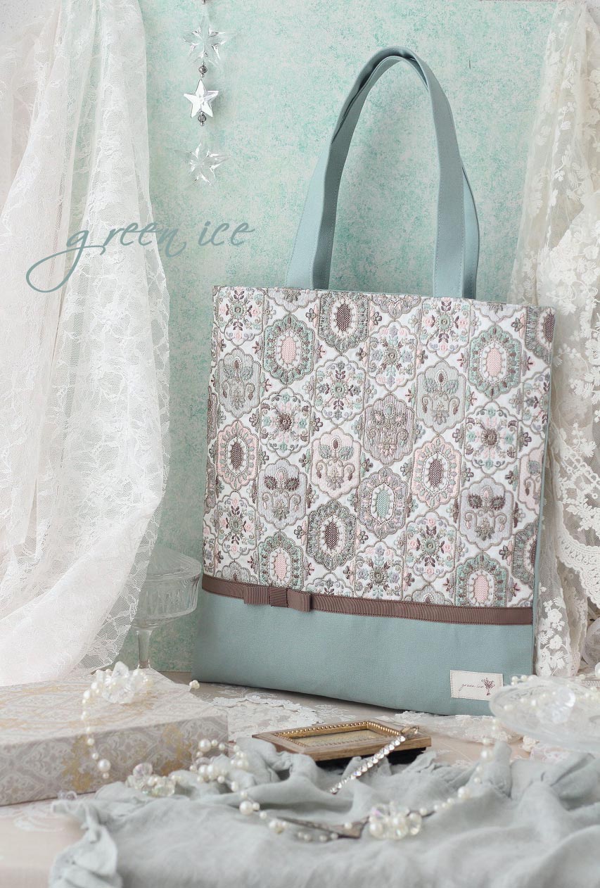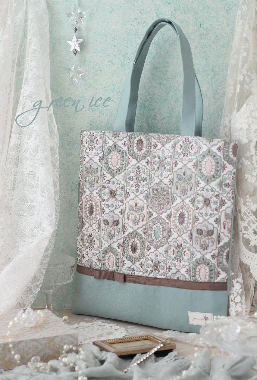 インド刺繍リボントートバッグ<フェアリードリーム>(ミントグリーン・ピンク)