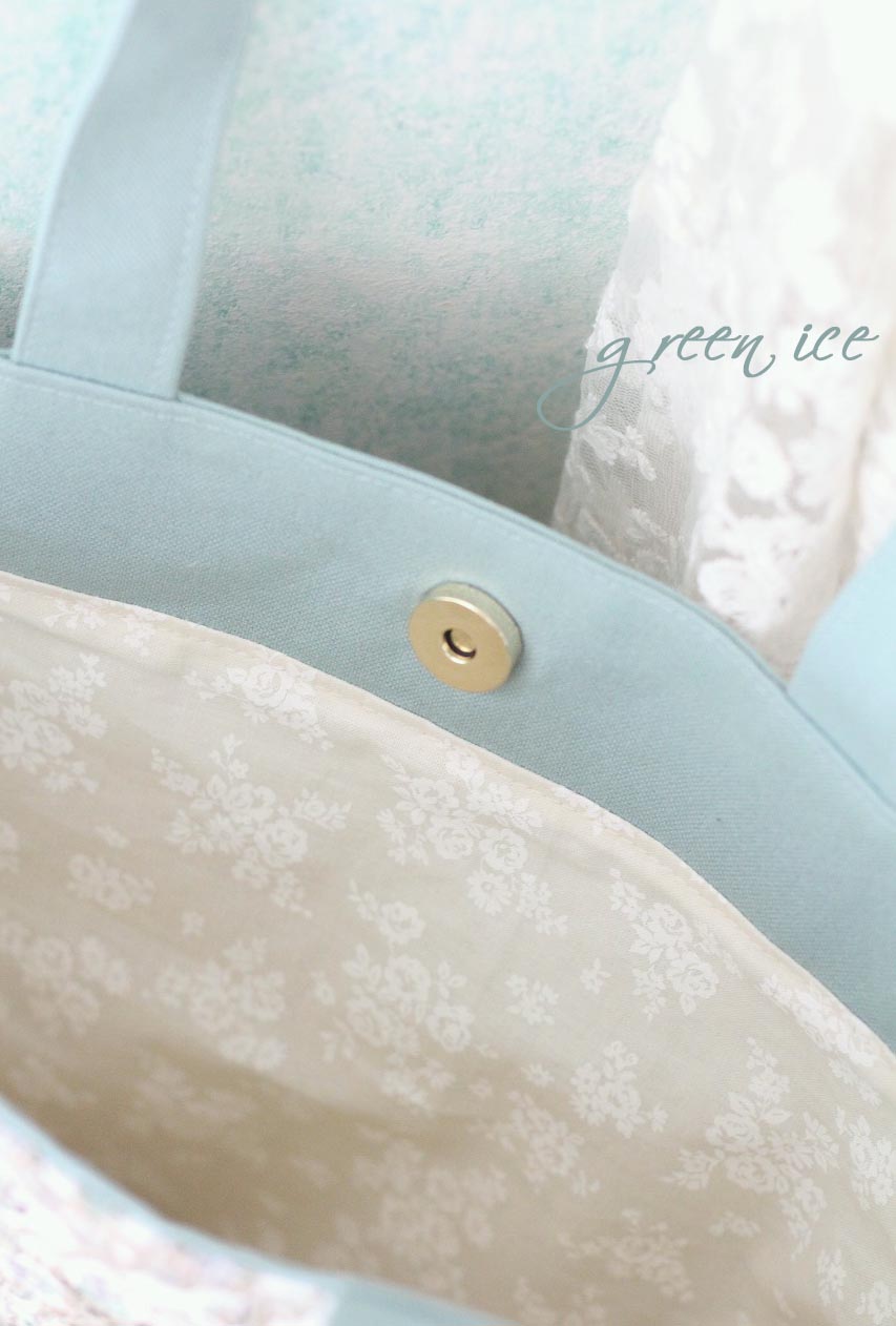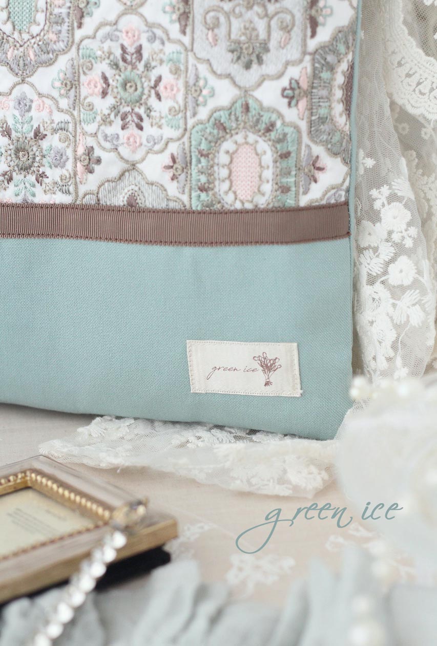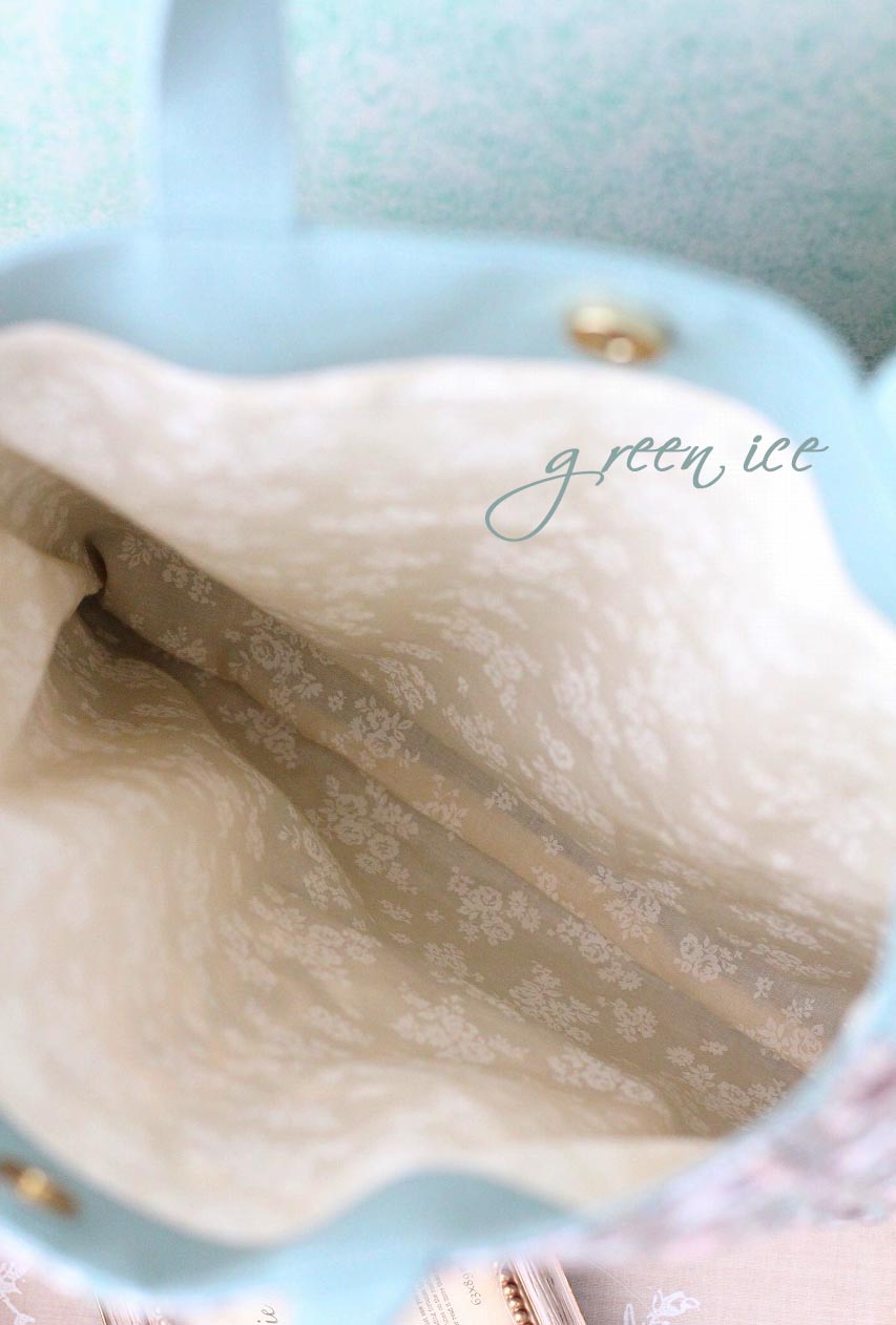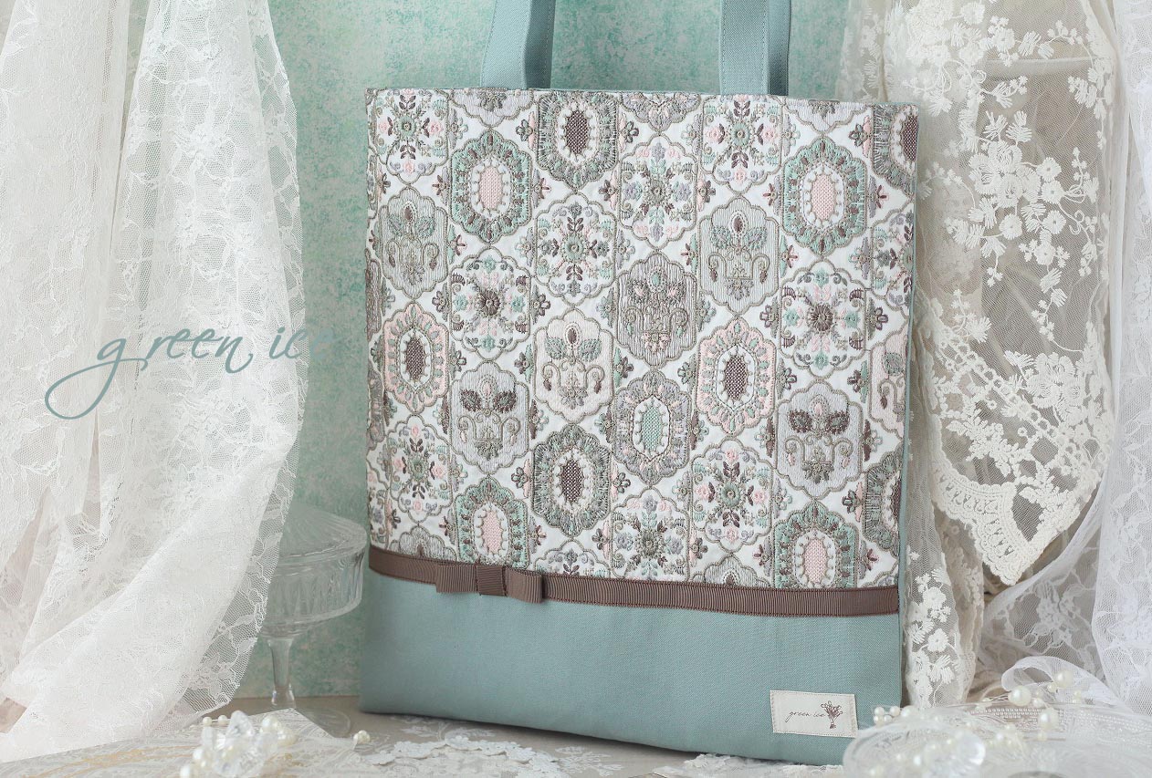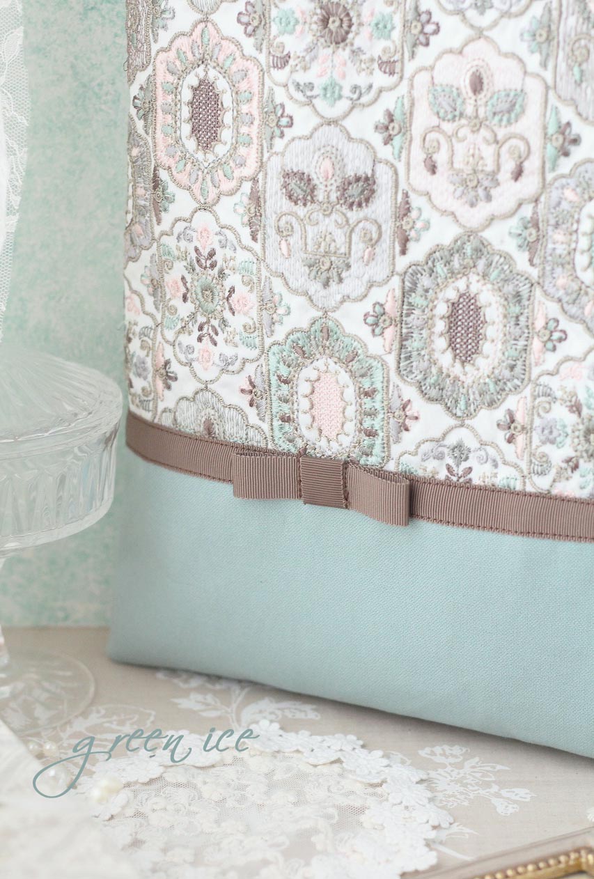 メインの表面の生地に、インド刺繍リボン生地のフェアリードリーム柄(カラー・ミントグリーン・ピンク)を使用しています。